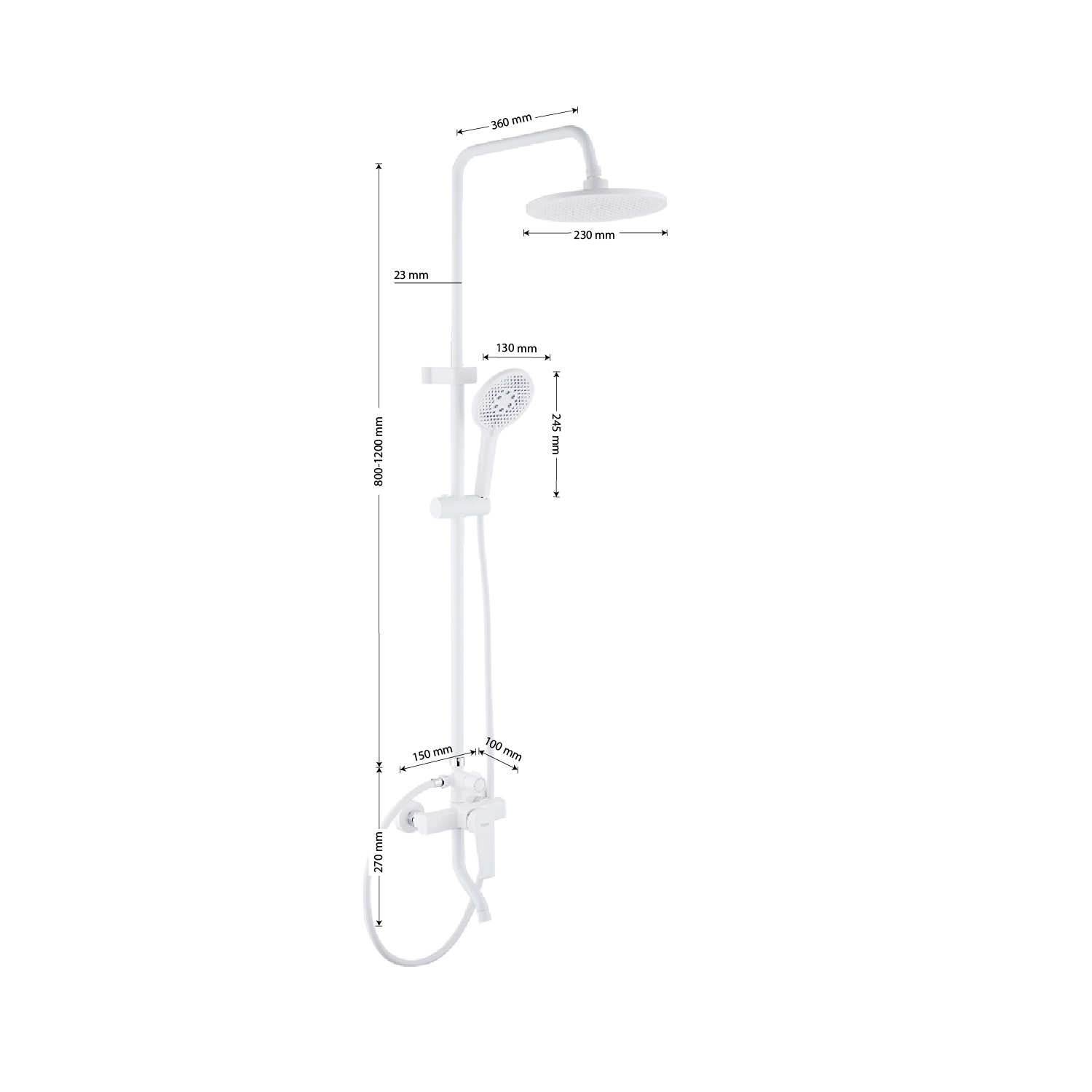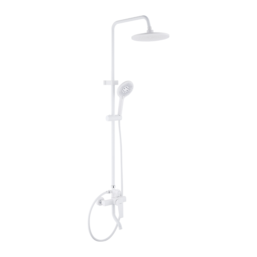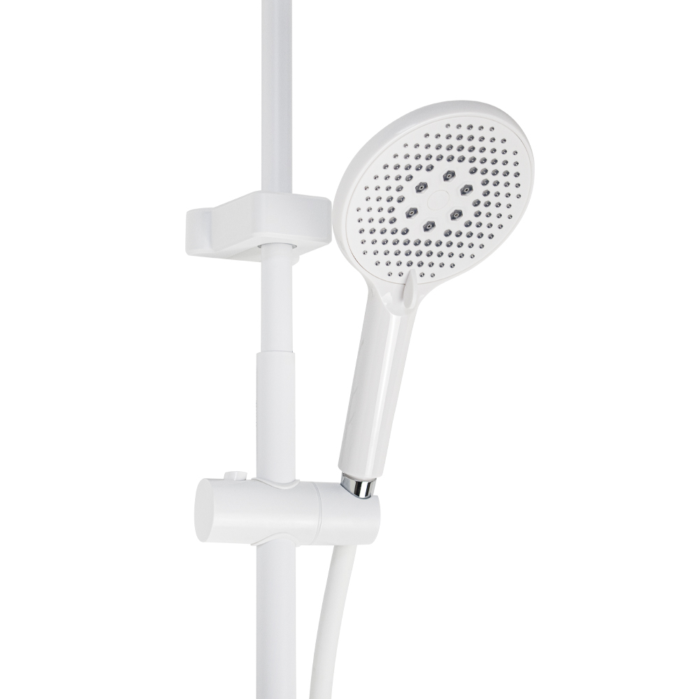 Смеситель + стойка душевая телескопическая "тропический душ" с двумя лейками в ванную / душевую комнату, белая. Смеситель шаровый, пластик АБС с поворотным коротким изливом, душевым шлангом и лейкой и дивертор переключения в трёх положениях. Картридж d = 35 мм, ручка литая, аэратор для экономии воды, чашки и эксцентрики. Душевая, регулируемая по высоте стойка с присоединением к корпусу смесителя и дополнительным креплением к стене и крючками для принадлежностей и большой круглой лейкой с эффектом тропического душа. Габаритные размеры: ширина смесителя 150 мм, высота 270 мм, длина излива корпуса 100 мм, высота телескопической стойки 800-1200 мм, длина излива стойки 360 мм, круглая двухрежимная душевая лейка d = 130 мм, круглая лейка тропический душ d = 230 мм, шланг 150 см. Вес - 3.07 кг, объём - 0.02941 м3. В комплекте корпус с изливом, чашки, эксцентрики, прокладки, стойка, дивертор, шланг, две лейки, крепления.