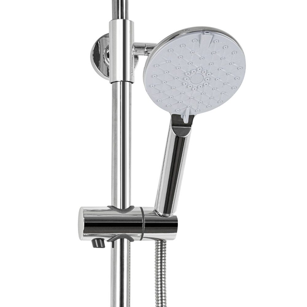 Смеситель + стойка душевая "тропический душ" с двумя лейками в ванную, хромированные. В дизайне душевой стойки гармонично соединились строгие линии и мягкие переходы. Она отлично впишется в интерьер ванной комнаты в минималистичном стиле. Глянцевое хромированное покрытие не стирается и сохраняет первозданный внешний вид в течение всего периода эксплуатации. Длительную работу без протечек обеспечивает смеситель с керамическим картриджем. Предусмотрен поворотный излив для наполнения ванны. Угол наклона верхнего душа можно регулировать в соответствии с потребностями каждого пользователя. Ручная лейка оснащена металлическим шлангом, который не перекручивается во время водных процедур. Смеситель шаровый с коротким поворотным изливом, душевым шлангом и лейкой и дивертор переключения в трёх положениях. Картридж d = 35 мм, ручка литая, аэратор для экономии воды, чашки и эксцентрики. Душевая стойка с присоединением к корпусу смесителя и дополнительным креплением к стене и большой круглой лейкой с эффектом тропического