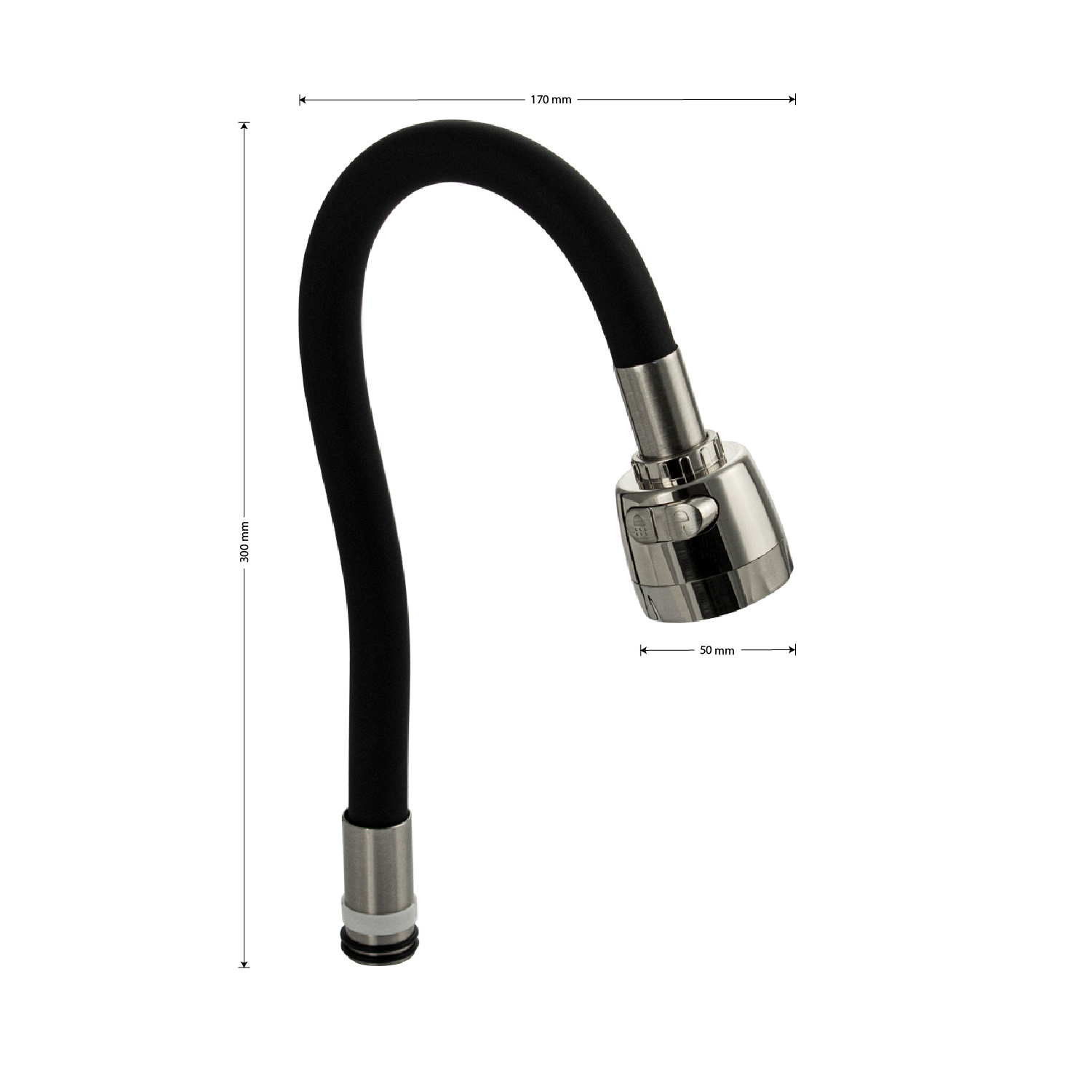 Излив к смесителю на кухню, гибкий с большим двухрежимным аэратором. Основным предназначением излива является подача воды, поступающей из смесителя. С-образная деталь имеет удобную конфигурацию и отлично подходит к смесителям на раковину и мойкам. Длинный излив обеспечит мощный поток воды. Универсальный излив для смесителя изготовлен из нержавеющей стали с силиконовой оболочкой черного цвета. За счет гибкости излива, Вы без труда сможете вымыть объемную посуду, фрукты, дотянуться до труднодоступных мест и любого содержимого мойки Идеально впишется в любой дизайн и может использоваться повсеместно. Устройство оснащено аэратором, проходя через него, вода насыщается множеством пузырьков воздуха, позволяя формировать струю в мягкий и ровный поток, а также экономить расход воды. Габаритные размеры: глубина 170 мм, высота 300 мм. Вес - 0,53 кг, объём - 0,00341 м3.