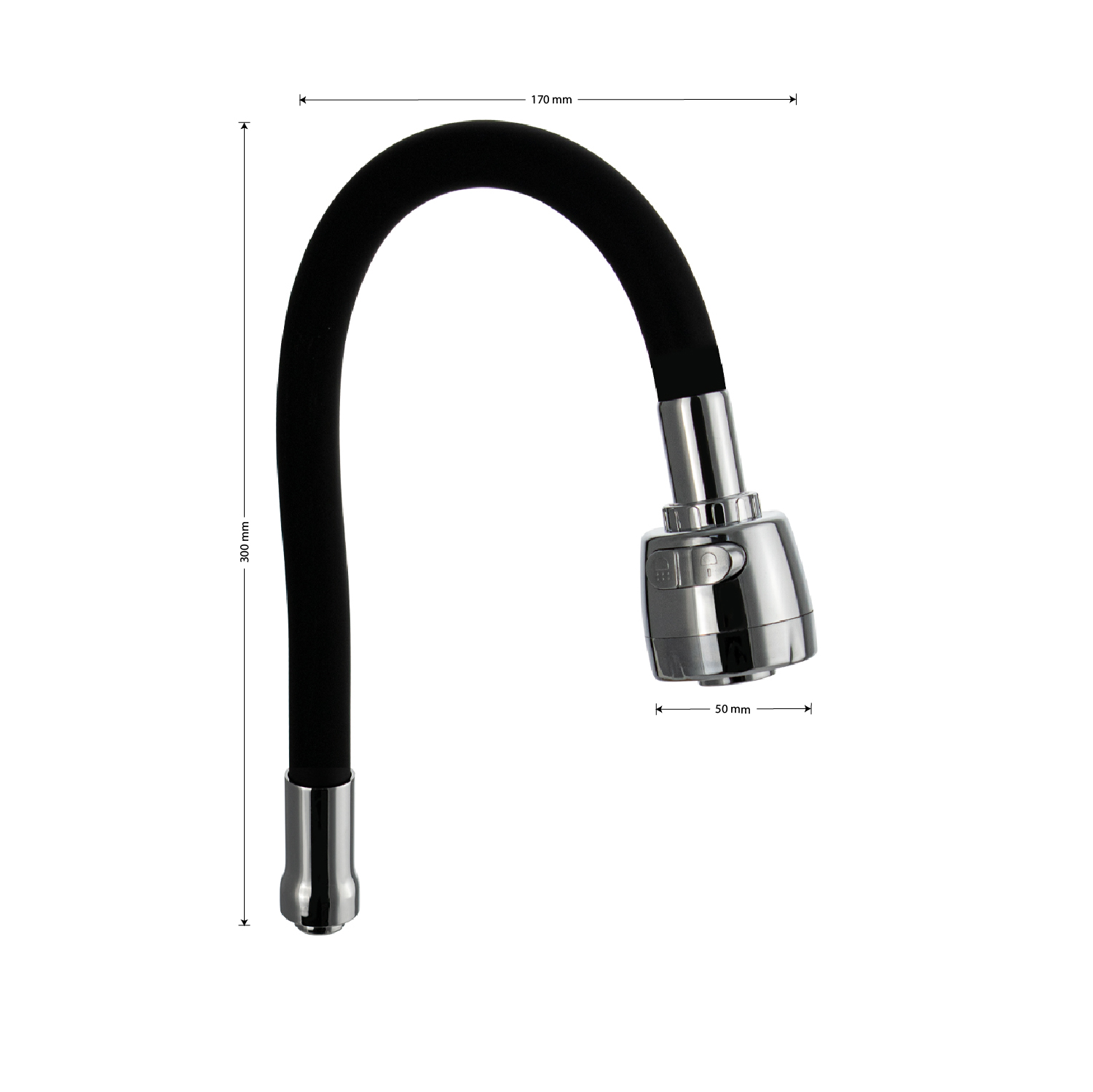 Излив к смесителю на кухню, гибкий с большим двухрежимным аэратором. Основным предназначением излива является подача воды, поступающей из смесителя. С-образная деталь имеет удобную конфигурацию и отлично подходит к смесителям на раковину и мойкам. Длинный излив обеспечит мощный поток воды. Универсальный излив для смесителя изготовлен из нержавеющей стали с силиконовой оболочкой черного цвета. За счет гибкости излива, Вы без труда сможете вымыть объемную посуду, фрукты, дотянуться до труднодоступных мест и любого содержимого мойки Идеально впишется в любой дизайн и может использоваться повсеместно. Устройство оснащено аэратором, проходя через него, вода насыщается множеством пузырьков воздуха, позволяя формировать струю в мягкий и ровный поток, а также экономить расход воды. Габаритные размеры: глубина 170 мм, высота 300 мм. Вес - 0,55 кг, объём - 0,00341 м3.