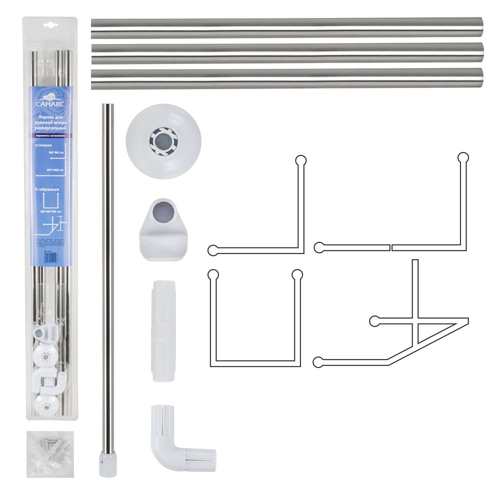 Карниз в ванную угловой, хромированный. Универсальный, П и Г - образная система, изготовлена из нержавеющей стали, трубок и пластиковых составных креплений. Изделие в собранном виде имеет усиленную (диаметр 25 мм) конструкцию размером 90x90x90 см, которая поддерживает/направляет шторку и позволяет прикрывать с трёх сторон место приёма водных процедур. Купить штангу можно как для установки над душевым поддоном, так и для того, чтобы ограничить распространение брызг при пользовании лейкой в классической ванной. Быстро и легко устанавливается. Полный комплект для установки с дюбелями с шурупами. Такой вид конструкции позволяет использовать его в любом помещении. Вес - 0.700 кг, объём - 0.00650 м3.