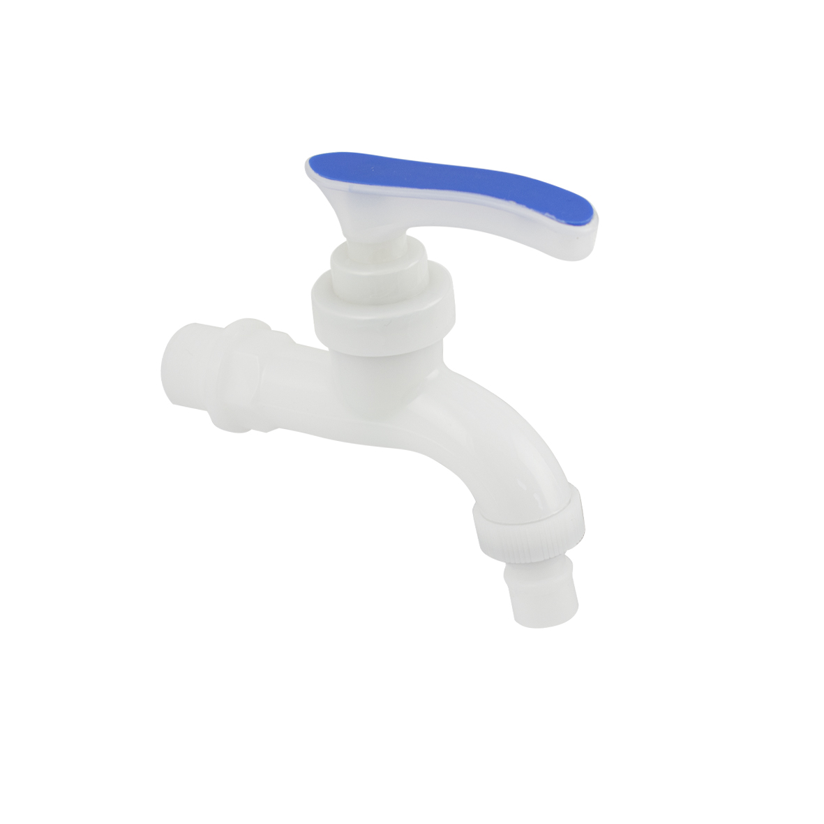 Кран водоразборный 1/2, из высокопрочного пластика АБС белый со штуцером, с возможностью подсоединения поливочного шланга. Верхняя часть ручки синего цвета. Габаритные размеры: высота 110 мм, 90 мм от стены, диаметр посадочного седла 25 мм. Металлокерамика, синяя ручка - флажок. Вес - 0,05 кг, объём - 0,0003 м3