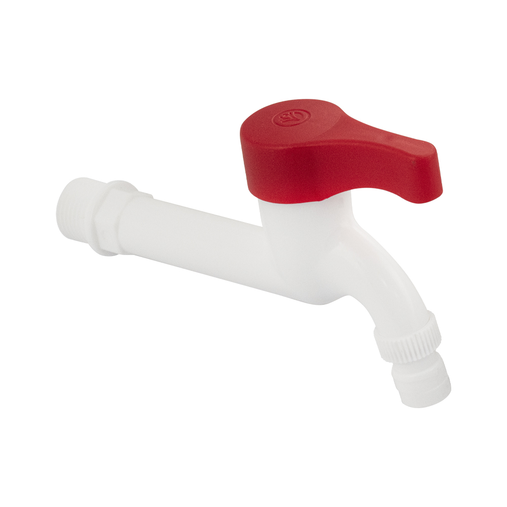 Кран водоразборный 1/2 н, из высокопрочного пластика АБС, белый, со штуцером, с возможностью подсоединения поливочного шланга. Габаритные размеры: длина 120 мм от стены, высота 85 мм. Металлокерамика, ручка - флажок. Вес - 0,060 кг, объём - 0,00035 м3. В комплекте корпус, прокладка.