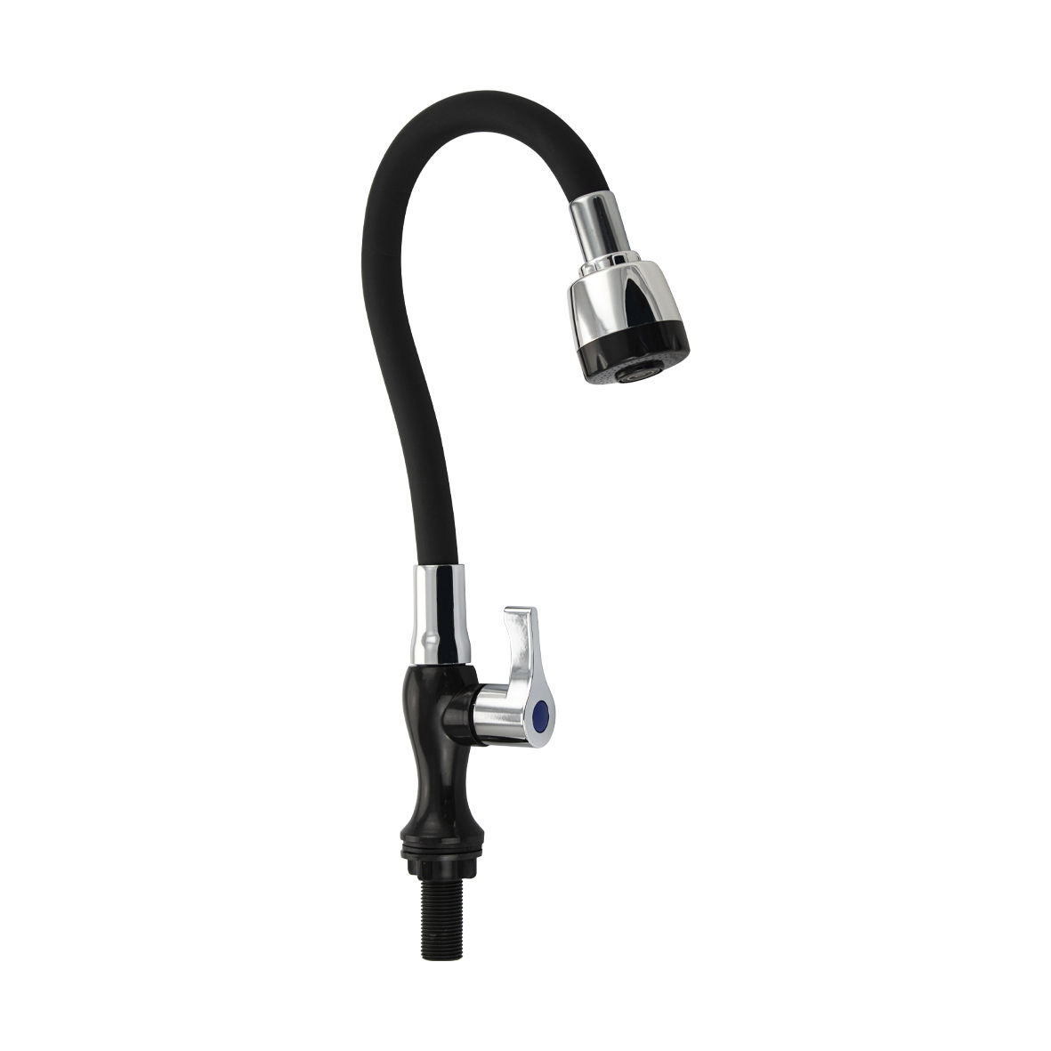 Кран на одну воду из высокопрочного пластика АБС, черного цвета, с гибким изливом, с двухрежимным большим аэратором. Крепление резьба - гайка. Кранбукса м/к, ручка флажок, поворот на 90˚. Габаритные размеры: высота 310 мм, регулировка расположения излива 210 мм, диаметр посадочного седла 40 мм, длина резьбы 55 мм. Вес - 0.11 кг, объём - 0.0030 м3. В комплекте корпус, крепёж