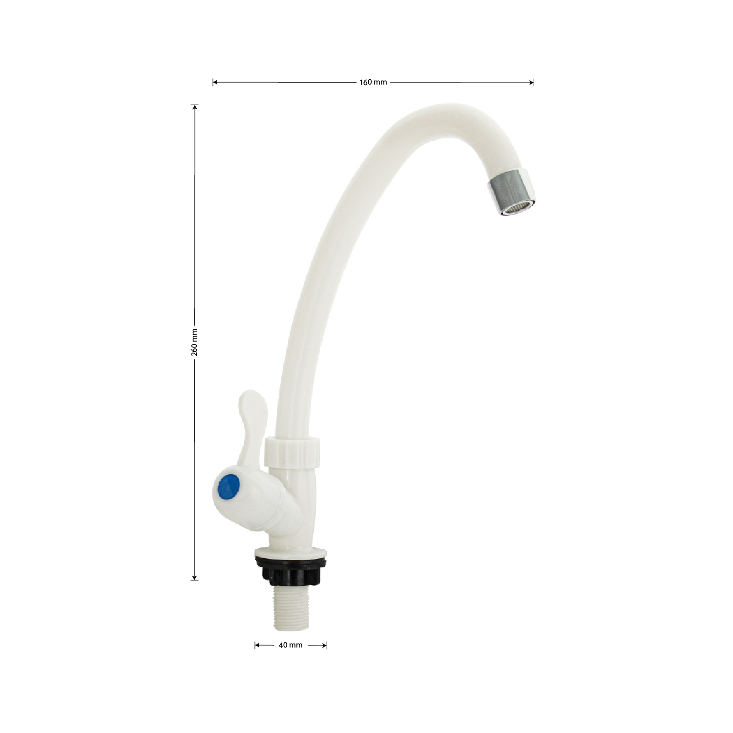 Кран на одну воду из высокопрочного пластика АБС - белый с аэратором для экономии воды. Крепление резьба - гайка. Кранбукса м/к, ручка - флажок, поворот на 90˚. Габаритные размеры: высота 260 мм, длина 160 мм, диаметр посадочного седла 40 мм, длина резьбы 40 мм. Вес - 0.17 кг, объём - 0.00153 м3. В комплекте корпус, прокладка.