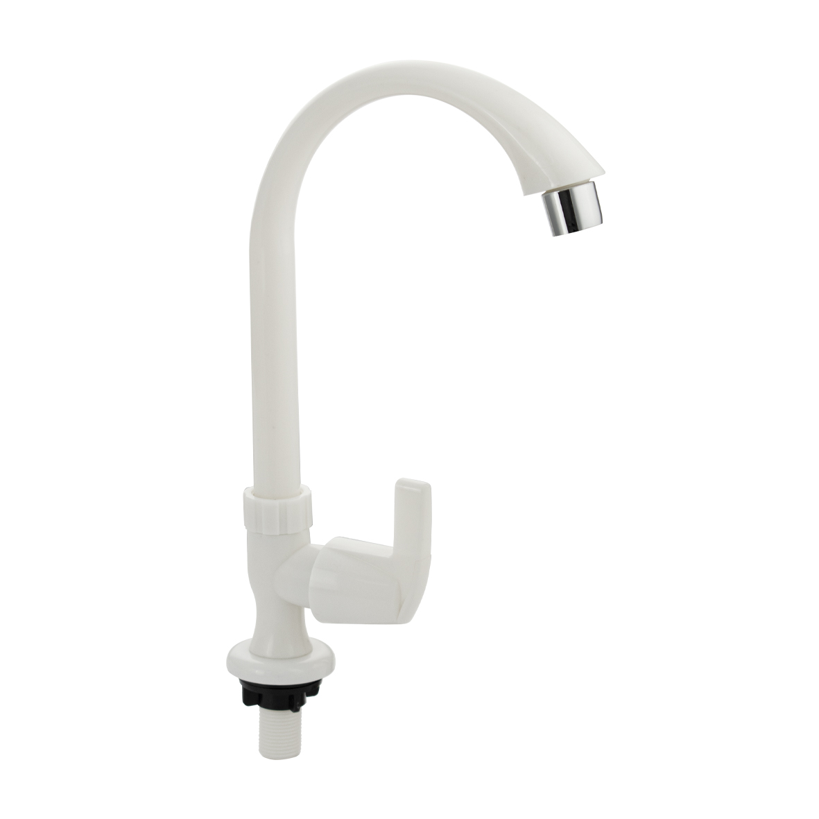 Кран на одну воду на раковину из высокопрочного пластика АБС - белый с аэратором для экономии воды. Крепление резьба - гайка. Кранбукса м/к, ручка - флажок, поворот на 90˚. Габаритные размеры: высота 300 мм, длина 200 мм, диаметр посадочного седла 50 мм, длина резьбы 45 мм. Вес - 0.21 кг , объём - 0.0017 м3. В комплекте корпус, прокладка