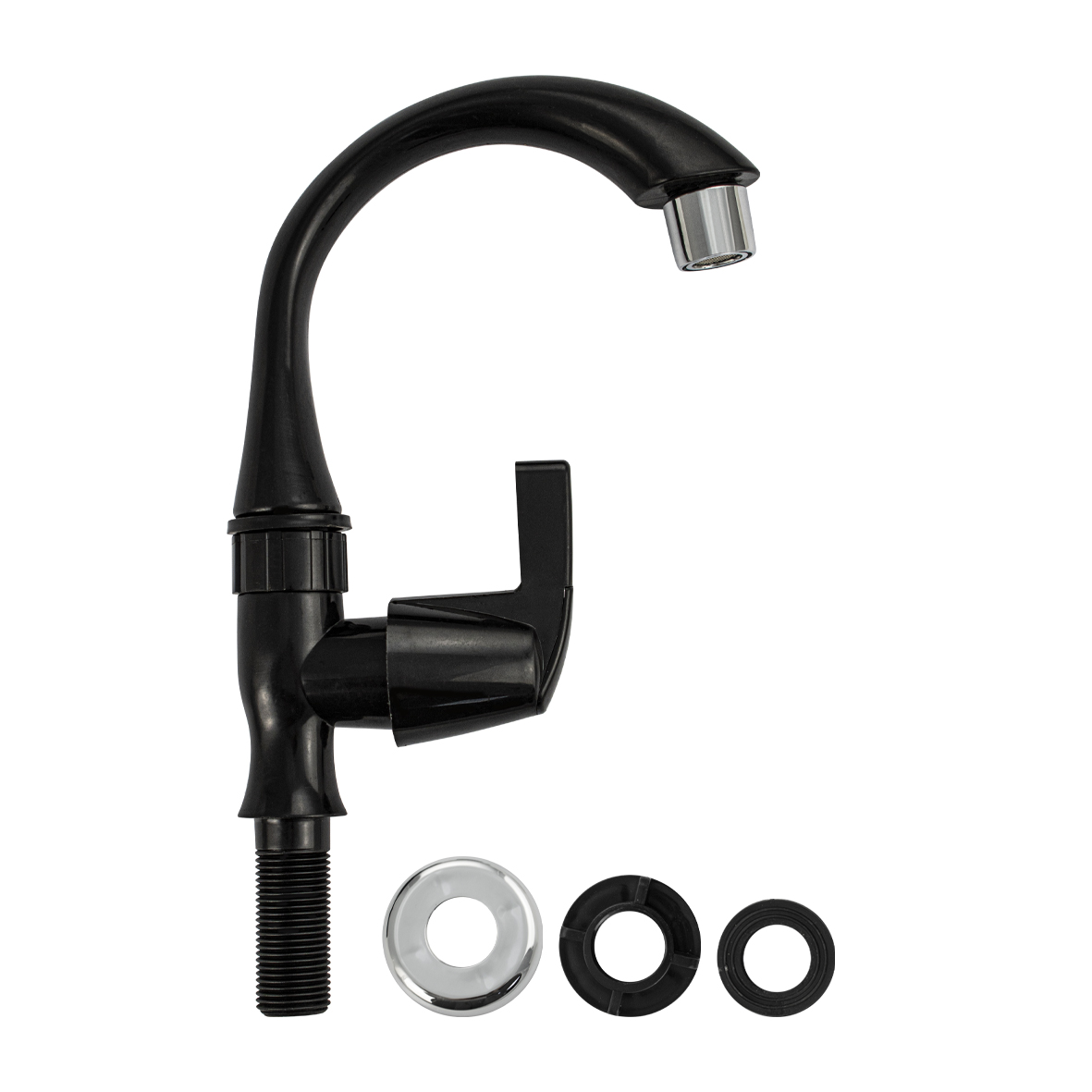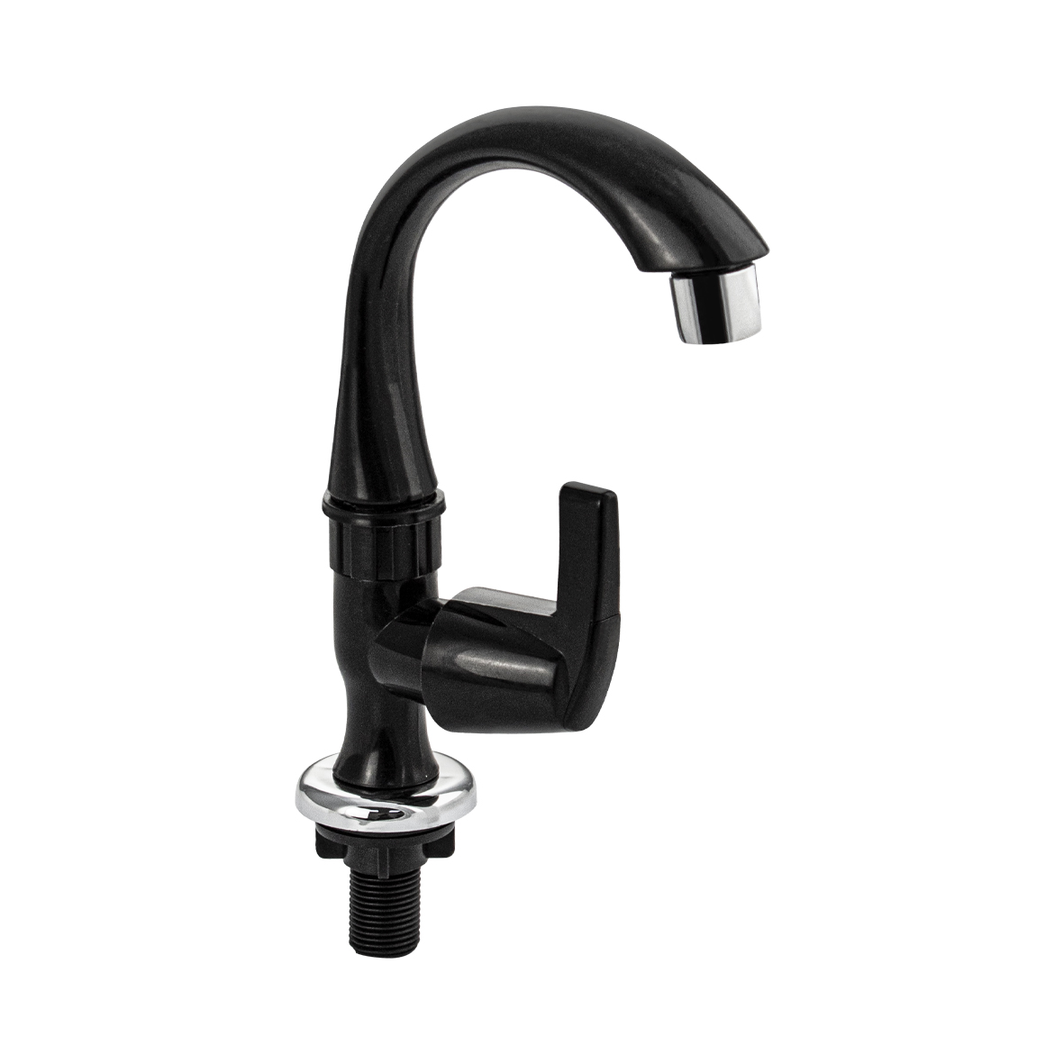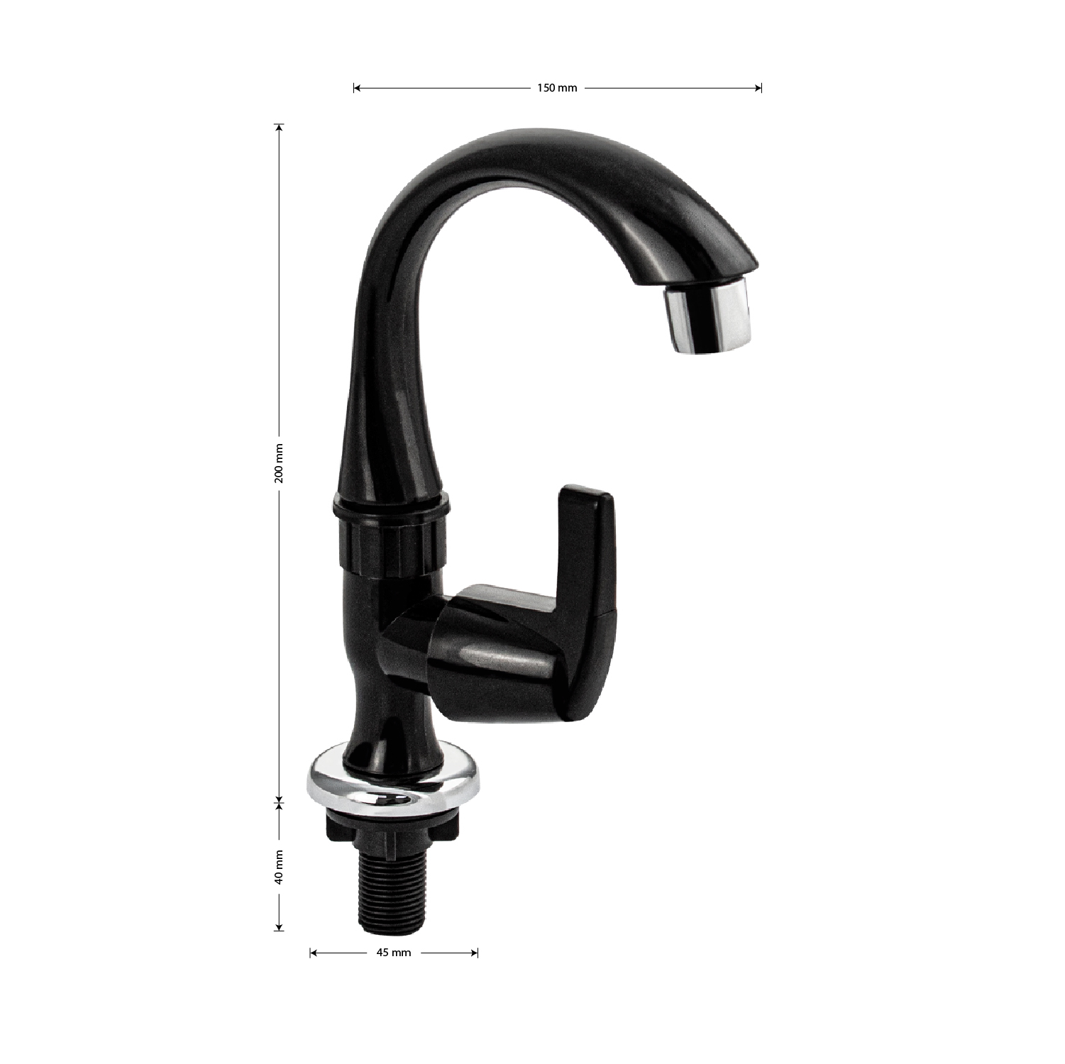 Кран на одну воду на раковину из высокопрочного пластика АБС - черный с аэратором для экономии воды. Крепление резьба - гайка. Кранбукса м/к, ручка - флажок, поворот на 90˚. Габаритные размеры: высота 200 мм, длина 150 мм, диаметр посадочного седла 45 мм, длина резьбы 40 мм. Вес - 0,2 кг, объём - 0,00125 м3. В комплекте корпус, прокладка.