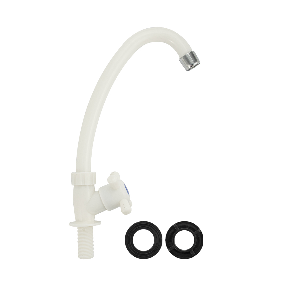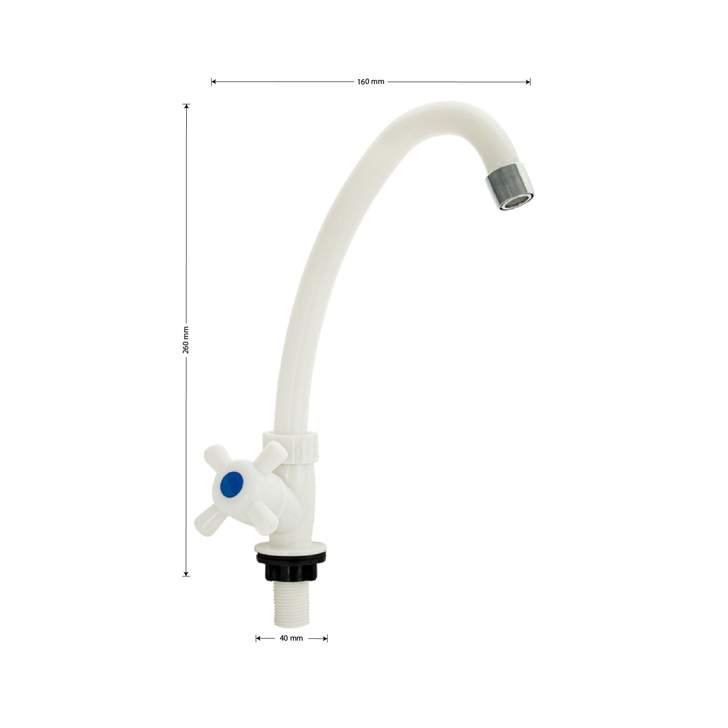 Кран на одну воду из высокопрочного пластика АБС - белый с аэратором для экономии воды. Крепление резьба - гайка. Кранбукса м/к, ручка - крест, поворот на 90˚. Габаритные размеры: высота 260 мм, длина 160 мм, диаметр посадочного седла 40 мм, длина резьбы 40 мм. Вес - 0.18 кг, объём - 0.00153 м3. В комплекте корпус, прокладка.