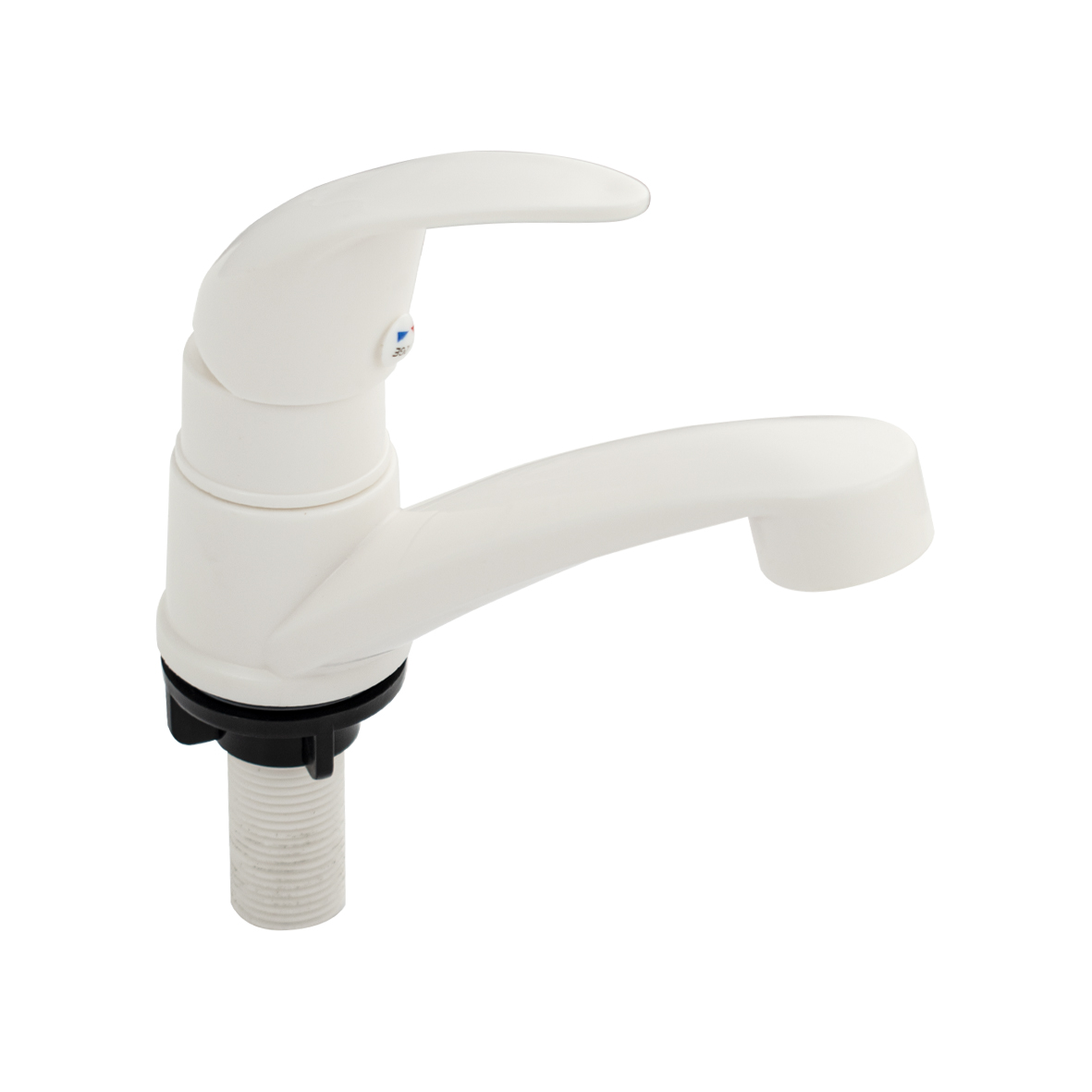 Кран на одну воду, из высокопрочного пластика АБС, белый, с аэратором для экономии воды, шаровый, с плоским коротким изливом. Крепление резьба - гайка. Габаритные размеры: высота 95 мм, длина 130 мм, диаметр посадочного седла 50 мм, длина резьбы 57 мм. Вес - 0,100 кг, объём - 0,00133 м3. В комплекте корпус, крепёж, паспорт.