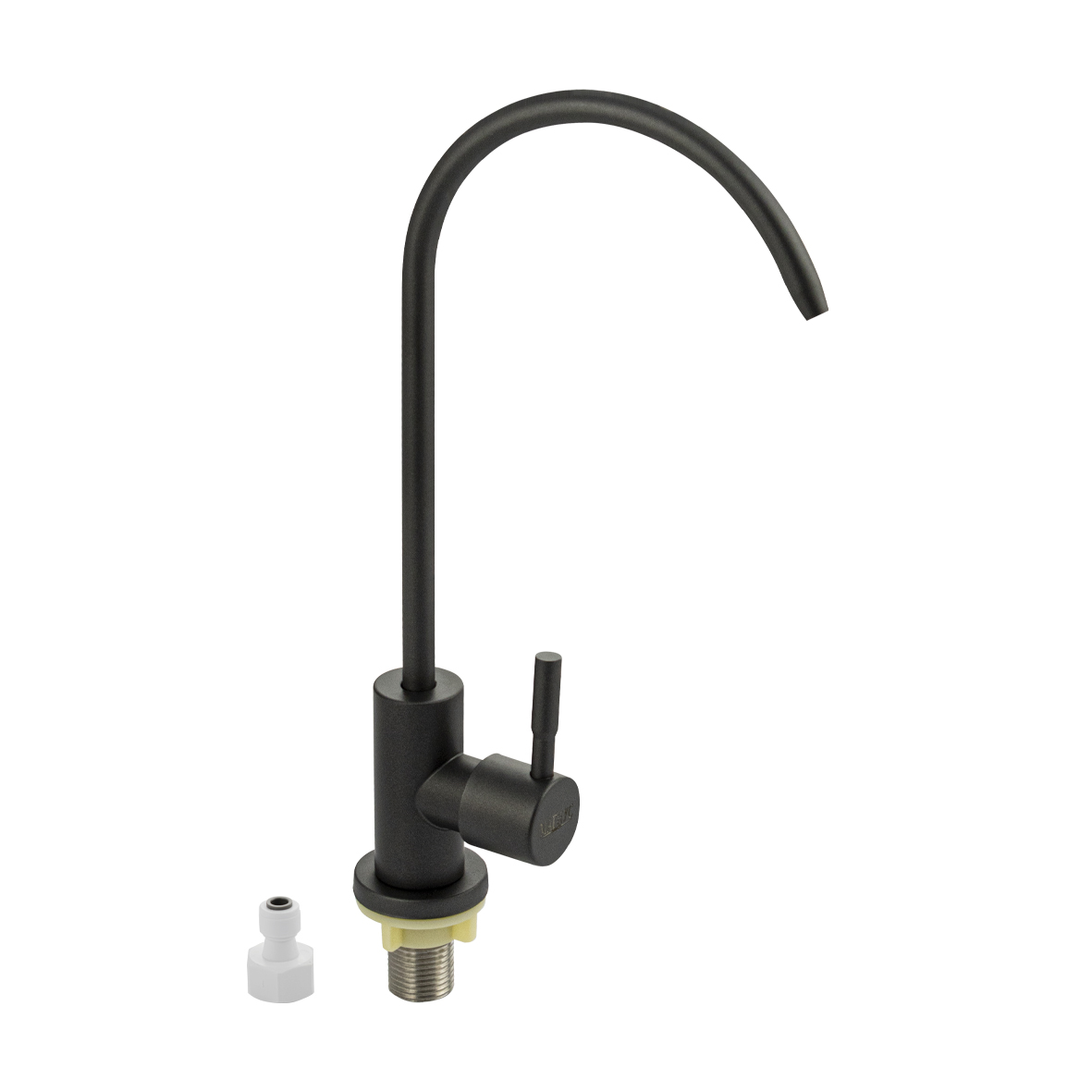 Кран на одну воду для питьевой воды с тонким изливом, для подключения фильтра тонкой очистки, матовый литой корпус цвета графит, из нержавеющей стали марки 201. Крепление резьба - гайка, подключение к водопроводной сети с помощью гибких шлангов с накидной гайкой на 1/2. Кранбукса м/к, ручка шток, поворот на 90˚. Такая модель может использоваться на домашней кухне, на даче, в медицинских учреждениях и общественных местах. Габаритные размеры: высота 250 мм, длина 135 мм, диаметр посадочного седла 40 мм, длина резьбы 45 мм. Вес - 0,33 кг, объём - 0,00010 м3. В комплекте корпус с изливом, крепёж.