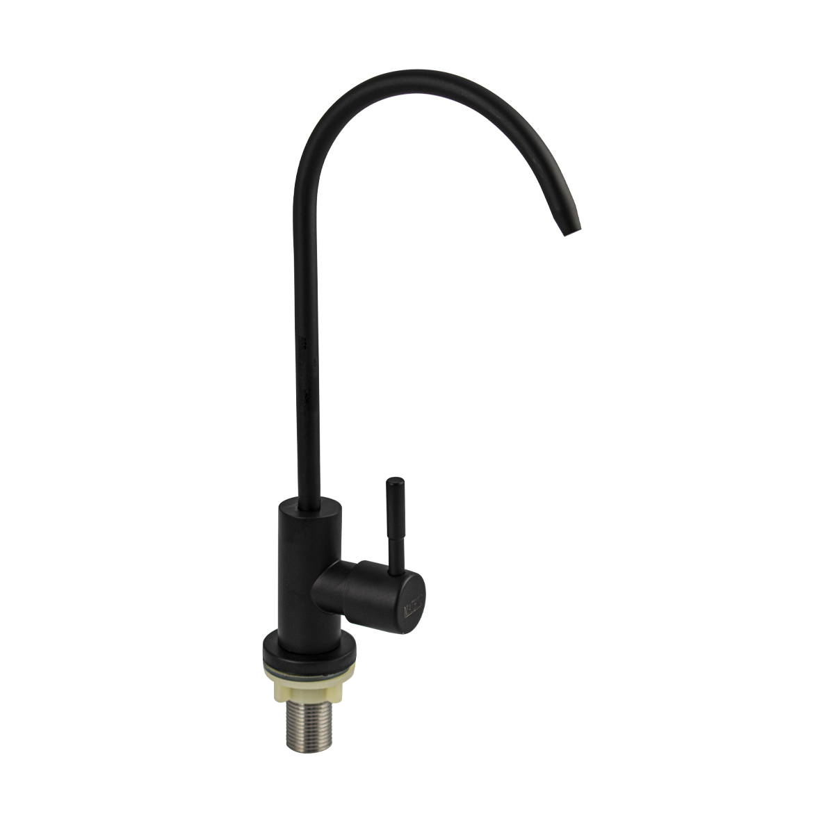 Кран на одну воду для питьевой воды с тонким изливом, для подключения фильтра тонкой очистки, матовый литой корпус чёрного цвета , из нержавеющей стали марки 201. Крепление резьба - гайка, подключение к водопроводной сети с помощью гибких шлангов с накидной гайкой на 1/2. Кранбукса м/к, ручка шток, поворот на 90˚. Такая модель может использоваться на домашней кухне, на даче, в медицинских учреждениях и общественных местах. Габаритные размеры: высота 250 мм, длина 135 мм, диаметр посадочного седла 40 мм, длина резьбы 45 мм. Вес - 0,30 кг, объём - 0,0033 м3. В комплекте корпус с изливом, крепёж.