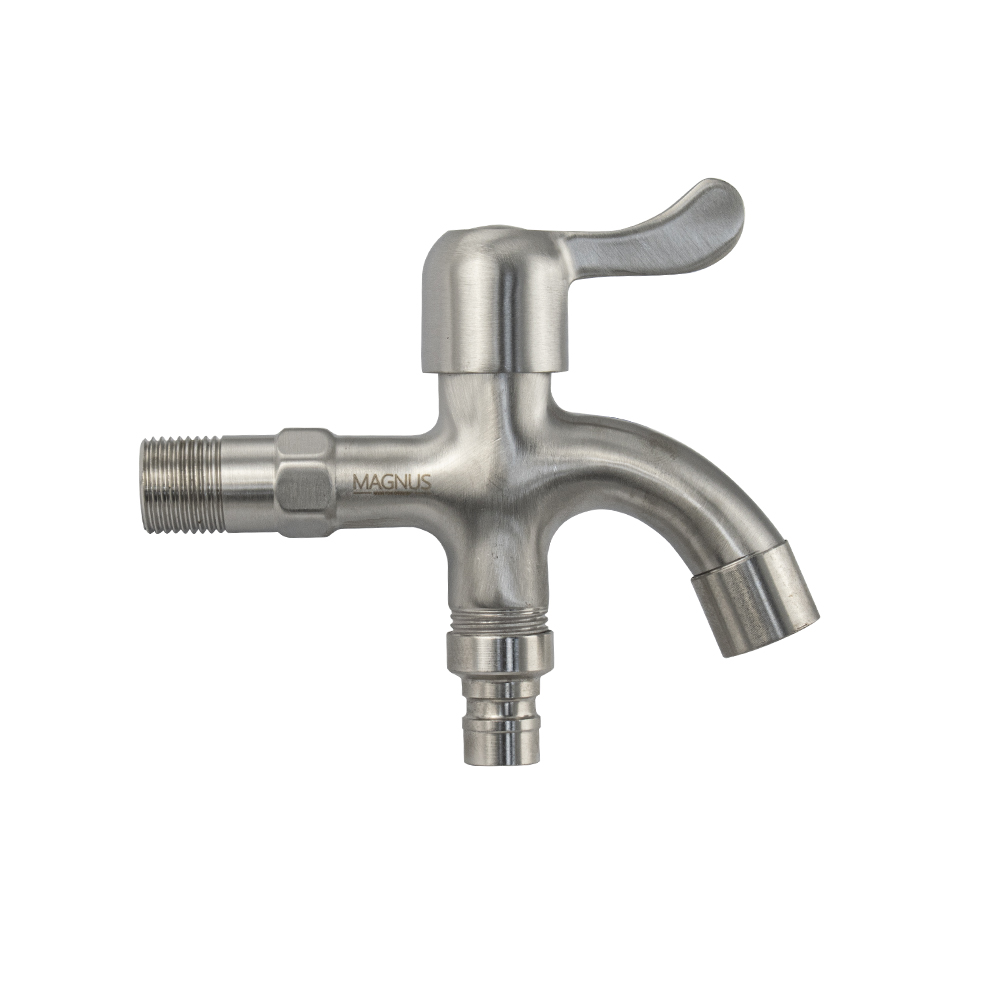 Кран водоразборный на 1/2", наружняя резьба, из нержавеющей стали марки SUS 304, с двойным выходом, металлокерамика, ручка флажок поворот на 90˚. Такая модель может использоваться на домашней кухне, на даче, в медицинских учреждениях и общественных местах. Габаритные размеры: высота 115 мм, длина 120 мм, диаметр посадочного седла 45 мм. Вес - 0,45 кг, объём - 0,00128 м3.
