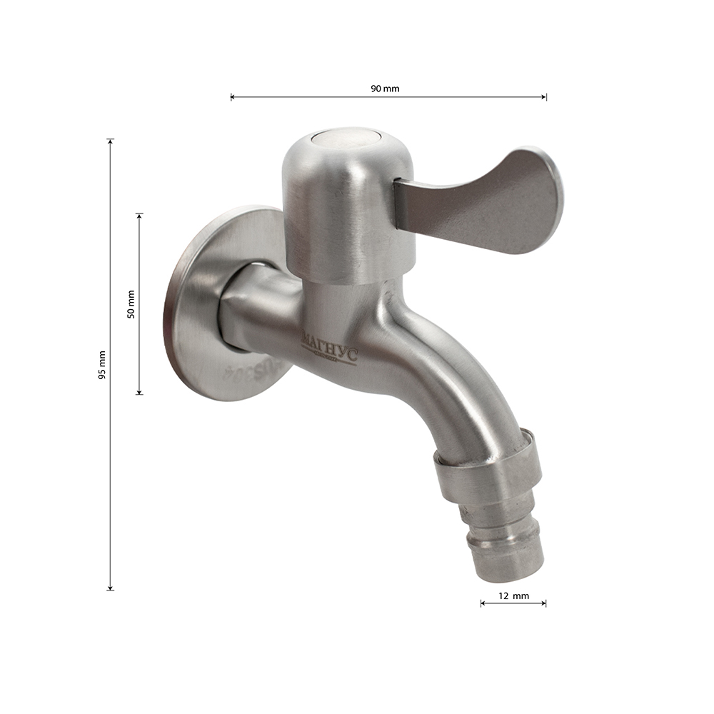 Кран водоразборный на 1/2", от стены 10 см, наружняя резьба, матовый корпус из нержавеющей стали марки 304, со штуцером для подключения поливочного шланга, металлокерамика, ручка флажок поворот на 90˚. Такая модель может использоваться на домашней кухне, на даче, в медицинских учреждениях и общественных местах. Габаритные размеры: высота 95 мм, длина 90 мм. Вес - 0,250 кг, объём - 0,00043 м3.
