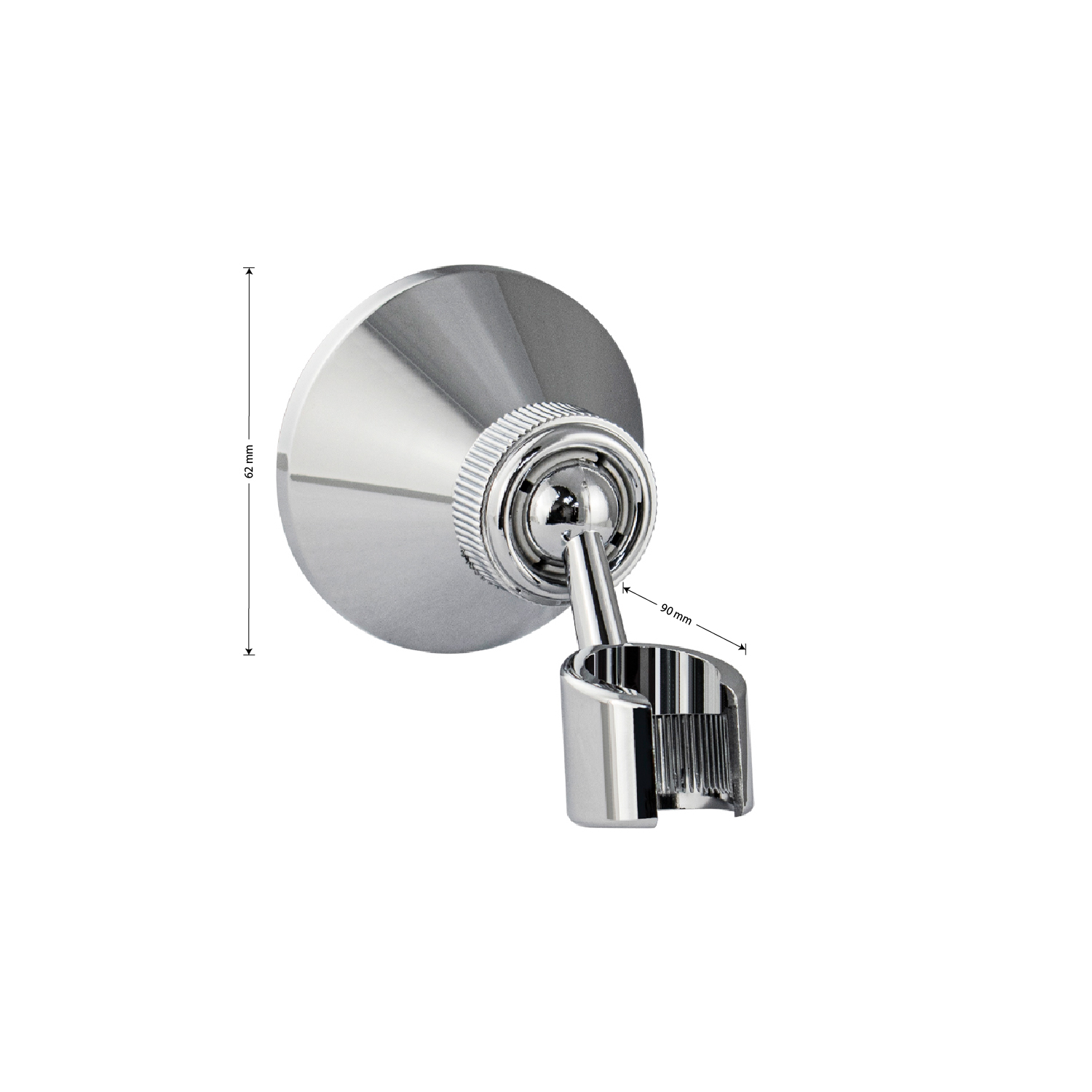 Кронштейн для душевой лейки пластиковый, хромированный, снабжен встроенным соединительным шарниром, выполняющим поворотную функцию. Крепление для душа позволяет фиксировать шланг в вертикальном положении возле стены или в другом удобном месте. Хромированное покрытие обеспечивает высокую устойчивость к коррозии и эстетичный внешний вид. С крепления легко удалить загрязнения, капли воды и известковый налет. Габаритные размеры: длина 90 мм, диаметр посадочного седла 62 мм. Вес - 0.22 кг, объём - 0.00036 м3.