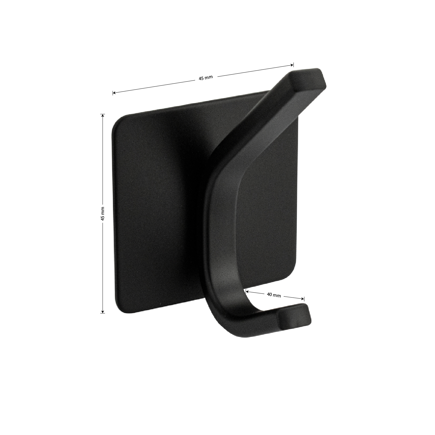 Крючок для принадлежностей металлический, черного цвета, двойной. Изготовлен из прочной нержавеющей стали марки SUS 304 с матовым покрытием графитового цвета, которое придает безупречный стильный вид и долговечность. На держателе с легкостью можно размещать вещи для сушки или вешать, как полотенца, так и одежду перед походом в душ. Идеально подойдет не только для ванной, но и для кухни, а также для дачи или гаража - при необходимости на держатель можно вешать любые предметы.Изделие крепится к стене с помощью самоклейки, без сверления. Габаритные размеры: ширина 45 мм, высота 45 мм, глубина 40 мм. Вес - 0,150 кг, объём - 0,00022 м3