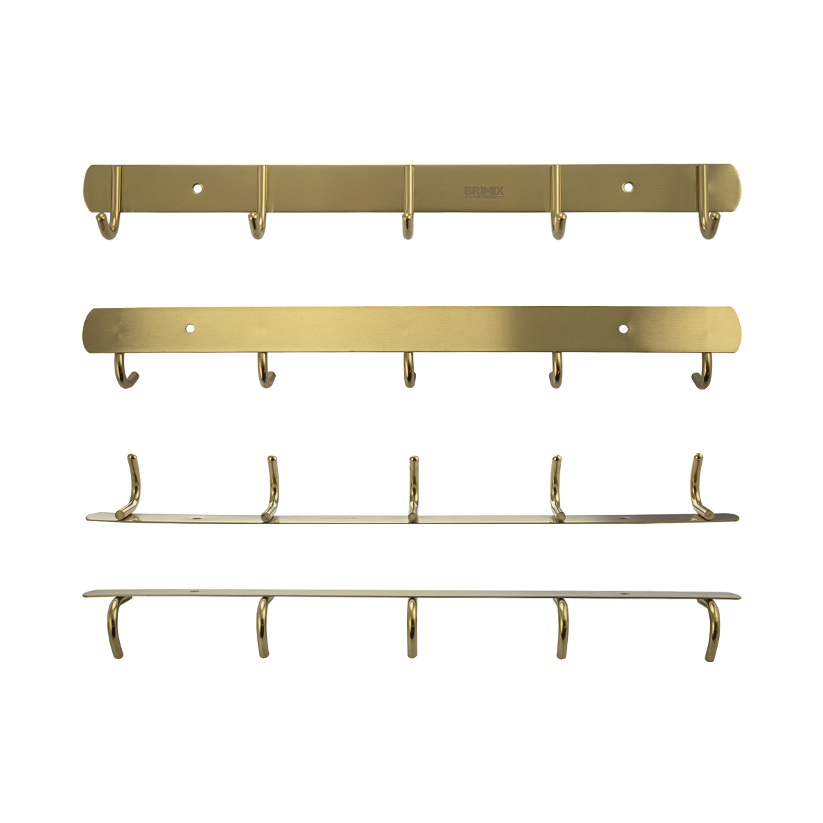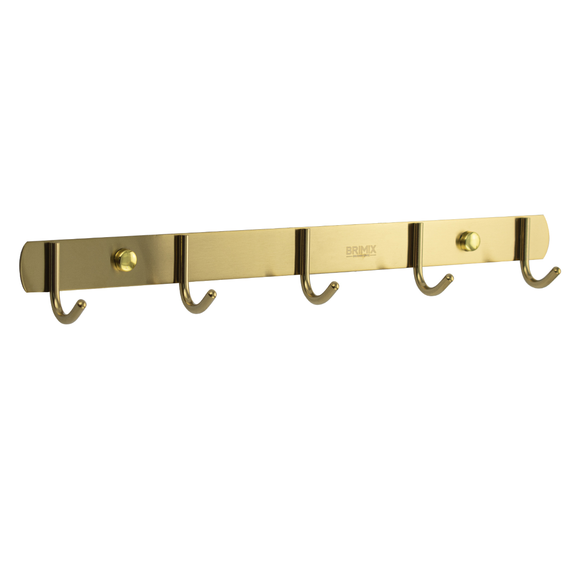Вешалка - держатель для принадлежностей, металлический, цвет матовое золото, с 5 крючками. Изготовлен из прочной нержавеющей стали марки SUS 304 с глянцевым покрытием, которое придает безупречный стильный вид и долговечность. Данное покрытие очень стойко переносит истирания и обеспечивает зеркальный блеск изделия. На держателе с легкостью можно размещать вещи для сушки или вешать, как полотенца, так и одежду перед походом в душ. Идеально подойдет не только для ванной, но и для кухни, а также для дачи или гаража - при необходимости на держатель можно вешать любые предметы. Изделие крепится к стене с помощью дюбелей и саморезов (входят в комплект). Габаритные размеры: длина 365 мм, высота 45 мм, глубина 35 мм. Вес - 0,20 кг, объём - 0, м3