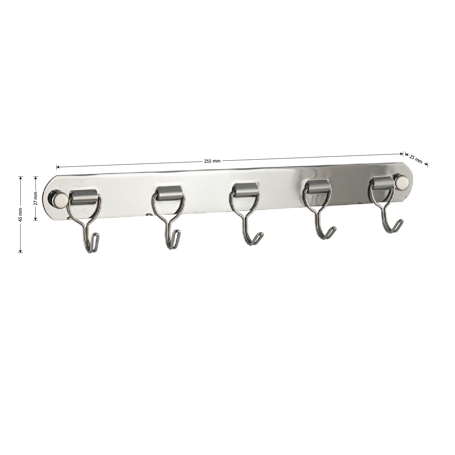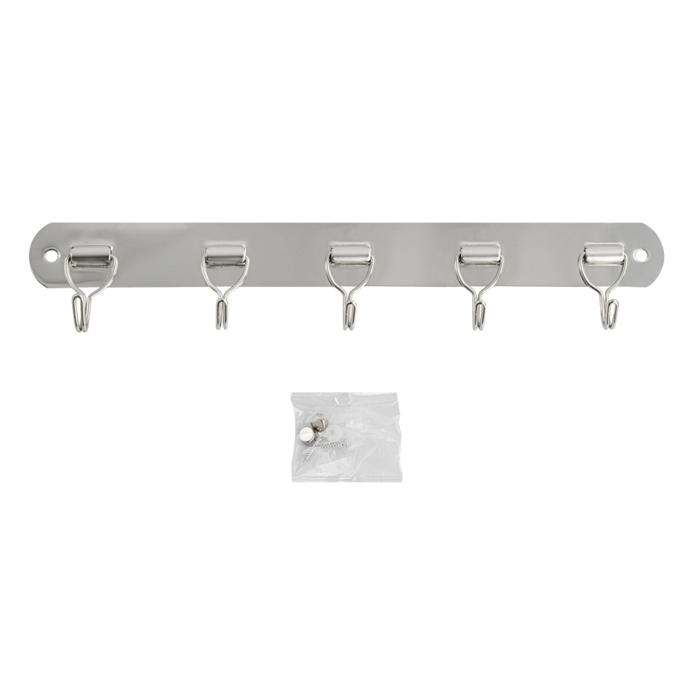 Вешалка - держатель для принадлежностей, металлический, хромированный, с пятью крючками. Изготовлен из прочной нержавеющей стали марки SUS 304 с хромированным покрытием, которое придает безупречный стильный вид и долговечность. Хромированное покрытие очень стойко переносит истирания и обеспечивает зеркальный блеск изделия. На держателе с легкостью можно размещать вещи для сушки или вешать, как полотенца, так и одежду перед походом в душ. Идеально подойдет не только для ванной, но и для кухни, а также для дачи или гаража - при необходимости на держатель можно вешать любые предметы. Изделие крепится к стене с помощью дюбелей и саморезов (входят в комплект). Габаритные размеры: длина 255 мм, высота 45 мм, глубина 25 мм, ширина планки 27 мм. Вес - 0,068 кг, объём - 0,0004 м3.