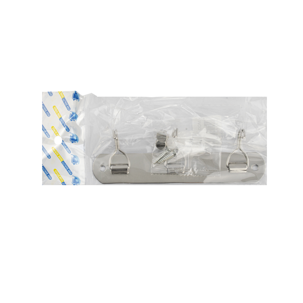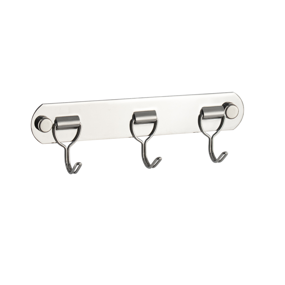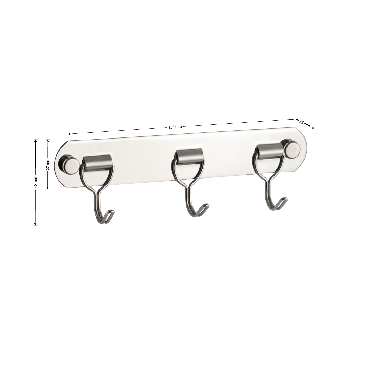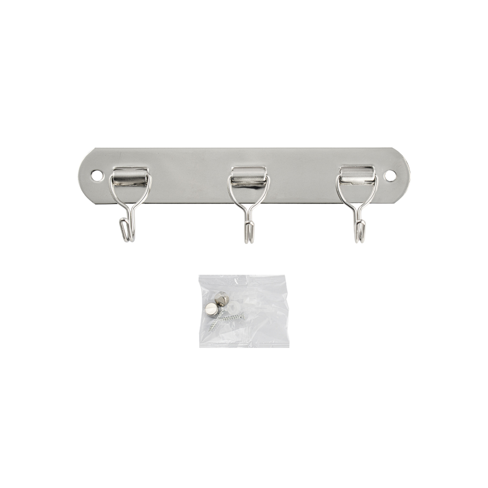 Вешалка - держатель для принадлежностей, металлический, хромированный, с тремя крючками. Изготовлен из прочной нержавеющей стали марки SUS 304 с хромированным покрытием, которое придает безупречный стильный вид и долговечность. Хромированное покрытие очень стойко переносит истирания и обеспечивает зеркальный блеск изделия. На держателе с легкостью можно размещать вещи для сушки или вешать, как полотенца, так и одежду перед походом в душ. Идеально подойдет не только для ванной, но и для кухни, а также для дачи или гаража - при необходимости на держатель можно вешать любые предметы. Изделие крепится к стене с помощью дюбелей и саморезов (входят в комплект). Габаритные размеры: длина 155 мм, высота 45 мм, глубина 25 мм, высота планки 27 мм. Вес - 0,048 кг, объём - 0,00023 м3.