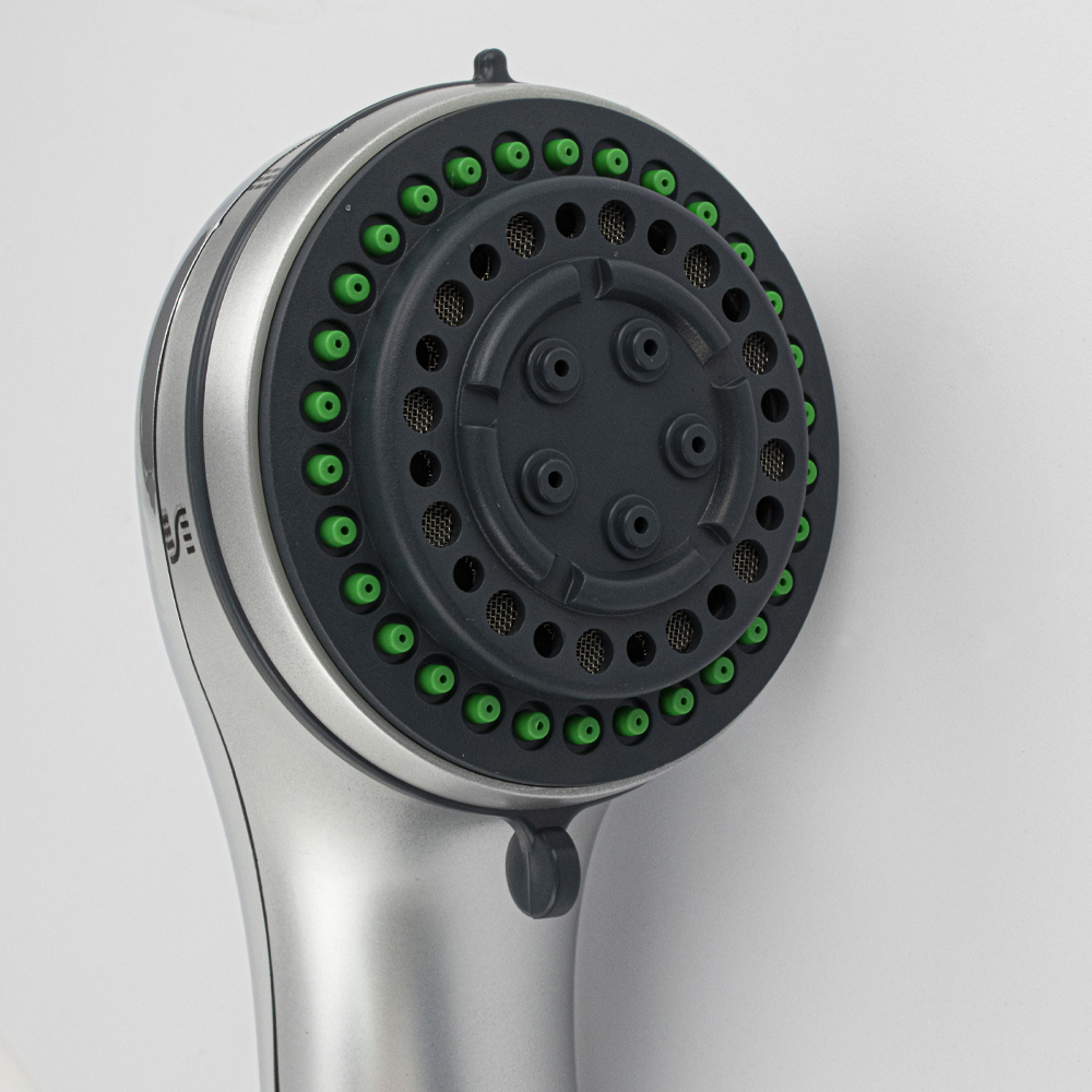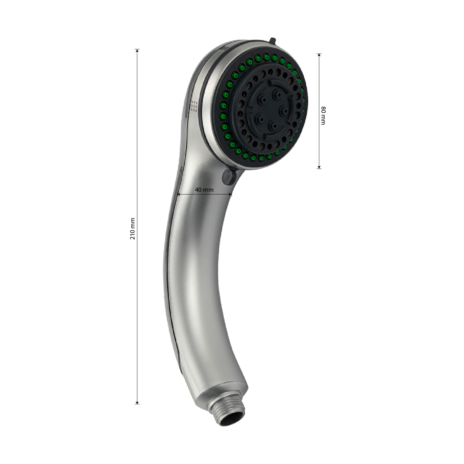 Душевая лейка отличается современным технологичным дизайном, высокой надежностью, долговечностью. Она изготовлена из влагостойкого пластика АБС и имеет декоративное покрытие цвета «хром», придающее устройству привлекательный вид и предохраняющее от агрессивного воздействия окружающей среды. Корпус отличается небольшим весом, что исключает повреждение напольной плитки или эмали ванны при случайном падении. Работает в четырех режимах с регулируемой интенсивностью: дождевая, обычная, струйный массаж. Ухаживать за душевой лейкой легко. Глянцевую поверхность достаточно протереть мягкой салфеткой, она в течение долгого времени не потеряет своего блеска. Система помогает мгновенно очистить силиконовые форсунки душевой лейки от известкового налета и загрязнения. Габаритные размеры: высота 210 мм, диаметр лейки 80 мм, диаметр корпуса 40 мм. Вес - 0,250 кг, объём - 0,00141 м3.