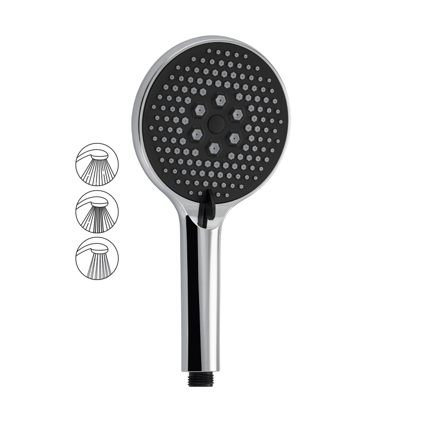Душевая лейка массажная,круглая, отличается современным технологичным дизайном, высокой надежностью, долговечностью. Она изготовлена из влагостойкого пластика АБС и имеет декоративное покрытие хромированного цвета с черной вставкой, придающее устройству привлекательный вид и предохраняющее от агрессивного воздействия окружающей среды. Корпус отличается небольшим весом, что исключает повреждение напольной плитки или эмали ванны при случайном падении. Работает в трёх режимах с регулируемой интенсивностью: дождевая, обычная, струйный массаж. Ухаживать за душевой лейкой легко. Глянцевую поверхность достаточно протереть мягкой салфеткой, она в течение долгого времени не потеряет своего блеска. Система помогает мгновенно очистить силиконовые форсунки душевой лейки от известкового налета и загрязнения. Габаритные размеры: высота 240 мм, диаметр 120 мм. Вес - 0,28 кг, объём - 0,002 м3.