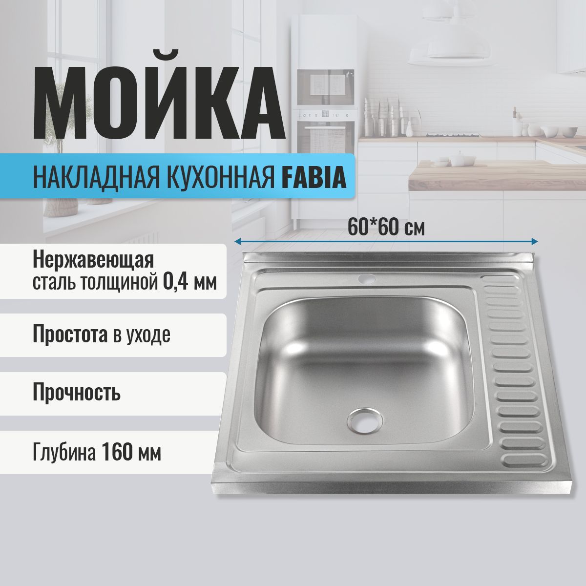 Накладная мойка FABIA из нержавеющей стали отличный вариант для кухни в стиле «эконом», она прослужит многие годы. Классическая форма и матовый цвет «хром» гармонично впишутся в любой интерьер и никогда не выйдут из моды. Оптимальный размер с площадкой для посуды позволяет свободно мыть посуду, без страха её разбить. Мойка устанавливается на тумбочку. Практичная площадка, расположенная по центру, даёт возможность вмонтировать любую понравившуюся модель смесителя. Габаритные размеры: ширина 600 мм, длина 600 мм, глубина 160 мм, толщина стали 0,4 мм. Вес - 1,600 кг, объём - 0,01461 м3.
