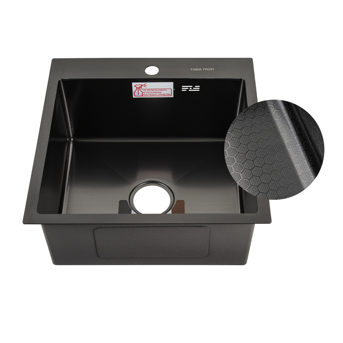 Мойка врезная, графит, с дизайнерским покрытием внутренней поверхности чаши в виде сот, большой сифон с переливом. Сифон с углубленной горловиной, мусоросборником и крышкой. Врезная кухонная мойка произведена из премиальной нержавеющей стали AISI 201, обладает повышенной прочностью. Особенность мойки заключается в конструкции ее дна, имеющего небольшой уклон. Благодаря такой особенности, вода быстрее уходит в слив, не застаивается, что способствует поддержанию гигиеничности в чаше. Скругленные внутренние углы облегчают уход за мойкой, препятствуют скоплению частичек грязи.Тихой в использовании мойку делает шумоизолирующее покрытие и накладки с обратной стороны мойки. В комплект входит универсальная раздвижная корзина, коврик, сифон, мойка, крепёж. Габаритные размеры: ширина 500 мм, длина 500 мм, глубина 220 мм, толщина основания 3,0 мм, чаша 0,8 мм. Вес - 7,7 кг, объём - 0,07722 м3.