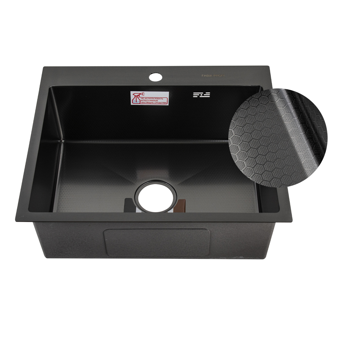 Мойка врезная, графит, с дизайнерским покрытием внутренней поверхости чаши в виде сот, большой сифон с переливом. Сифон с углубленной горловиной, мусоросборником и крышкой. Врезная кухонная мойка произведена из премиальной нержавеющей стали AISI 201, обладает повышенной прочностью. Особенность мойки заключается в конструкции ее дна, имеющего небольшой уклон. Благодаря такой особенности, вода быстрее уходит в слив, не застаивается, что способствует поддержанию гигиеничности в чаше. Скругленные внутренние углы облегчают уход за мойкой, препятствуют скоплению частичек грязи. Тихой в использовании мойку делает шумоизолирующее покрытие и накладки с обратной стороны мойки. В комплект входит универсальная раздвижная корзина, коврик, сифон, мойка, крепёж. Габаритные размеры: ширина 600 мм, длина 500 мм, глубина 220 мм, толщина основания 3,0 мм, чаша 0,8 мм. Вес - 8,5 кг, объём - 0,09504 м3.