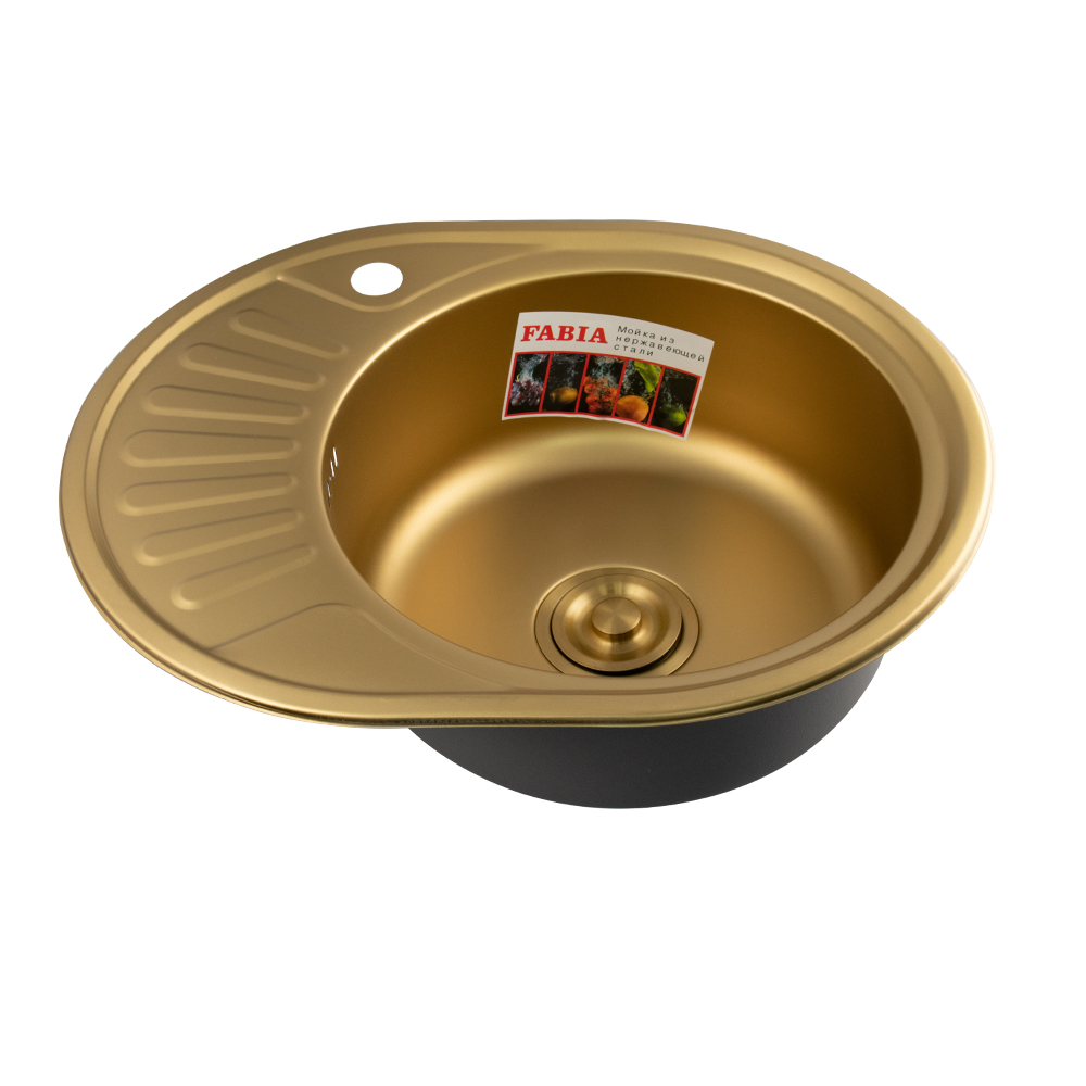 Врезная мойка FABIA из нержавеющей стали отличный вариант для кухни, она прослужит многие годы. Классическая форма и цвет под золото гармонично впишутся в любой интерьер и никогда не выйдут из моды. Оптимальный размер с площадкой для посуды позволяет свободно мыть посуду, без страха её разбить. Мойка врезается в столешницу. Специальное дополнительное антишумовое покрытие, нанесенное на обратную сторону чаш, разработано для снижения шума воды в мойке. Конструкция краев мойки, крепления и специальная уплотнительная прокладка обеспечивает максимально плотное прилегание к столешнице и защищает от протекания. Практичная площадка, расположенная по центру, даёт возможность вмонтировать любую понравившуюся модель смесителя. В комплекте сифон с большой горловиной с переливом, крепёж. Габаритные размеры: ширина 570 мм, длина 450 мм, глубина 180 мм, толщина стали 0,8 мм. Вес - 2,800 кг, объём - 0,01248 м3.