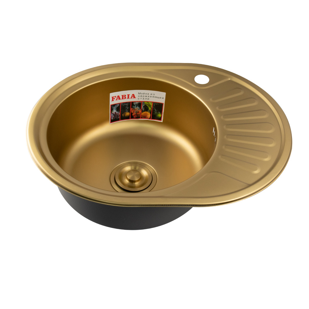 Врезная мойка FABIA из нержавеющей стали отличный вариант для кухни, она прослужит многие годы. Классическая форма и цвет под золото гармонично впишутся в любой интерьер и никогда не выйдут из моды. Оптимальный размер с площадкой для посуды позволяет свободно мыть посуду, без страха её разбить. Мойка врезается в столешницу. Специальное дополнительное антишумовое покрытие, нанесенное на обратную сторону чаш, разработано для снижения шума воды в мойке. Конструкция краев мойки, крепления и специальная уплотнительная прокладка обеспечивает максимально плотное прилегание к столешнице и защищает от протекания. Практичная площадка, расположенная по центру, даёт возможность вмонтировать любую понравившуюся модель смесителя. В комплекте сифон с большой горловиной с переливом, крепёж. Габаритные размеры: ширина 570 мм, длина 450 мм, глубина 180 мм, толщина стали 0,8 мм. Вес - 2,800 кг, объём - 0,01248 м3.