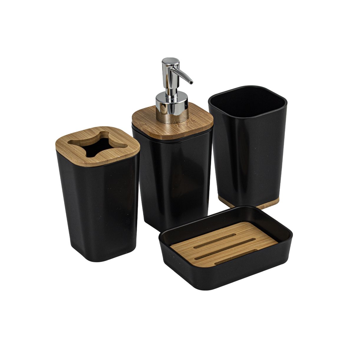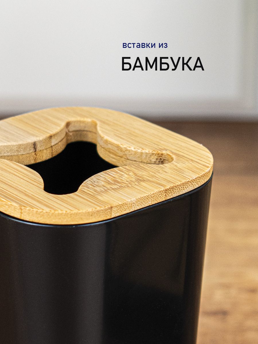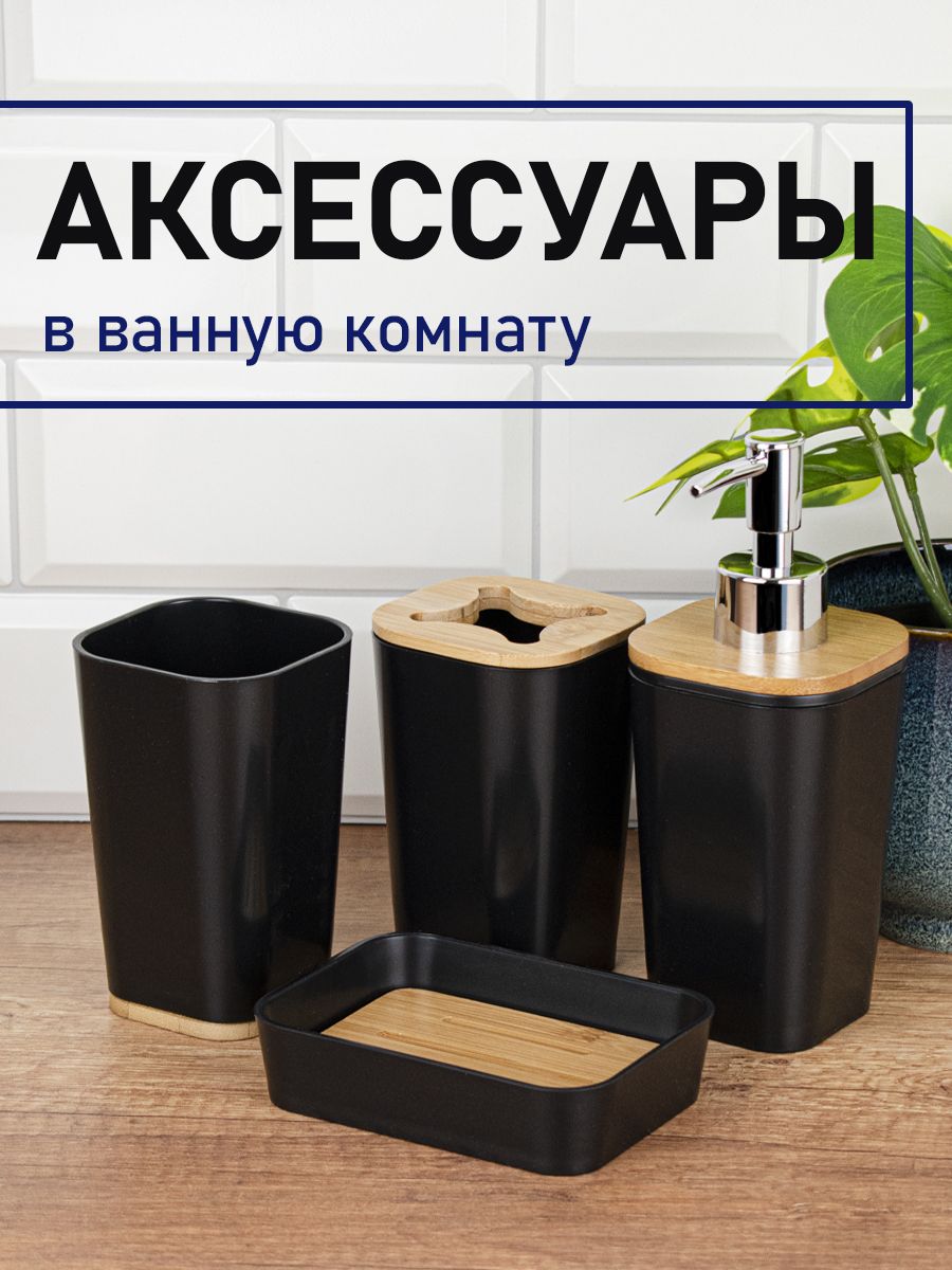 Набор аксессуаров для ванной комнаты настольный, пластик АБС, черный с вставками из бамбука, состоит из 4 предметов: дозатора для жидкого мыла, стакана (подставки) для зубных щёток, мыльницы и стакана для принадлежностей. Все предметы изготовлены из современного экологичного пластика, идеально подходящего для влажных помещений. Пластик плотный, легко чистится. Отсутствует неприятный запах. Аксессуары украшены вставками из бамбука, что придаёт им эксклюзивный и современный вид. Данный набор придаст интерьеру. Вашей комнаты уют и гармонию, позволит оформить интерьер в едином современном стиле. Габаритные размеры стакана для щеток: высота 115 мм, ширина 75 мм, глубина 75 мм. Габаритные размеры стакана под принадлежности: высота 115 мм, ширина 70 мм, глубина 70 мм. Габаритные размеры дозатора: высота 180 мм, ширина 70 мм, глубина 70 мм. Габаритные размеры мыльницы: ширина 120 мм, глубина 90 мм, высота 28 мм. Вес - 0,610 кг, объём - 0,00475 м3.