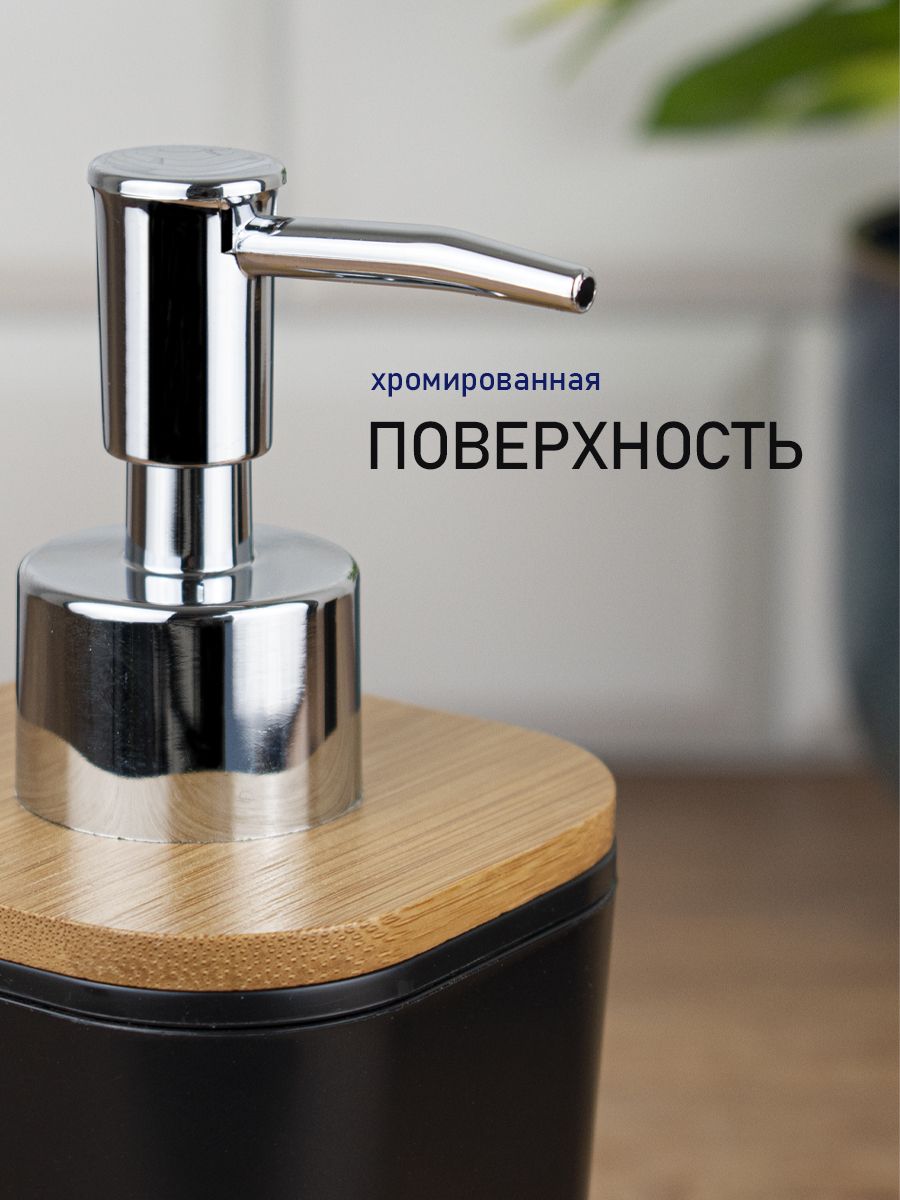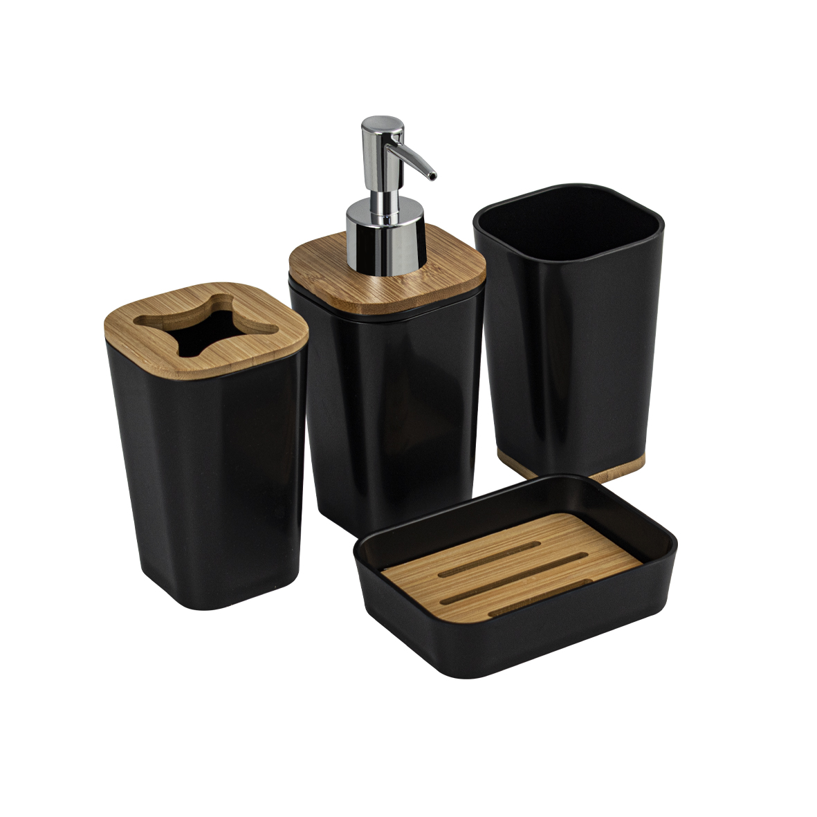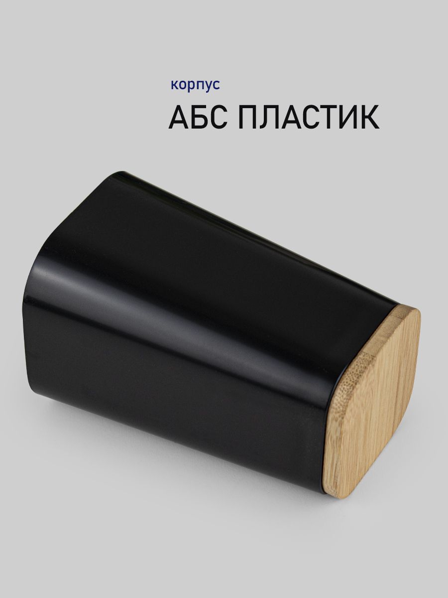 Набор аксессуаров для ванной комнаты настольный, пластик АБС, черный с вставками из бамбука, состоит из 4 предметов: дозатора для жидкого мыла, стакана (подставки) для зубных щёток, мыльницы и стакана для принадлежностей. Все предметы изготовлены из современного экологичного пластика, идеально подходящего для влажных помещений. Пластик плотный, легко чистится. Отсутствует неприятный запах. Аксессуары украшены вставками из бамбука, что придаёт им эксклюзивный и современный вид. Данный набор придаст интерьеру. Вашей комнаты уют и гармонию, позволит оформить интерьер в едином современном стиле. Габаритные размеры стакана для щеток: высота 115 мм, ширина 75 мм, глубина 75 мм. Габаритные размеры стакана под принадлежности: высота 115 мм, ширина 70 мм, глубина 70 мм. Габаритные размеры дозатора: высота 180 мм, ширина 70 мм, глубина 70 мм. Габаритные размеры мыльницы: ширина 120 мм, глубина 90 мм, высота 28 мм. Вес - 0,610 кг, объём - 0,00475 м3.