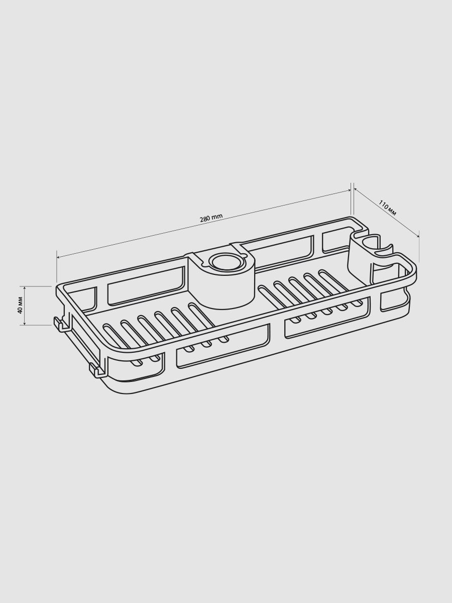 Полка для душевых стоек и стоек тропический душ, глубокая с двумя крючками и держателем для лейки, хромированная, произведена из долговечного и прочного ABS-пластика, благодаря чему она прослужит дольше во влажном помещении ванной комнаты, не желтеет, не ржавеет и не деформируется, не впитывает запахи. Габаритные размеры: длина 280 мм, ширина 110 мм, высота 40 мм, диаметр втулки 23 мм. Вес - 0,250 кг, объём - 0,00337 м3.