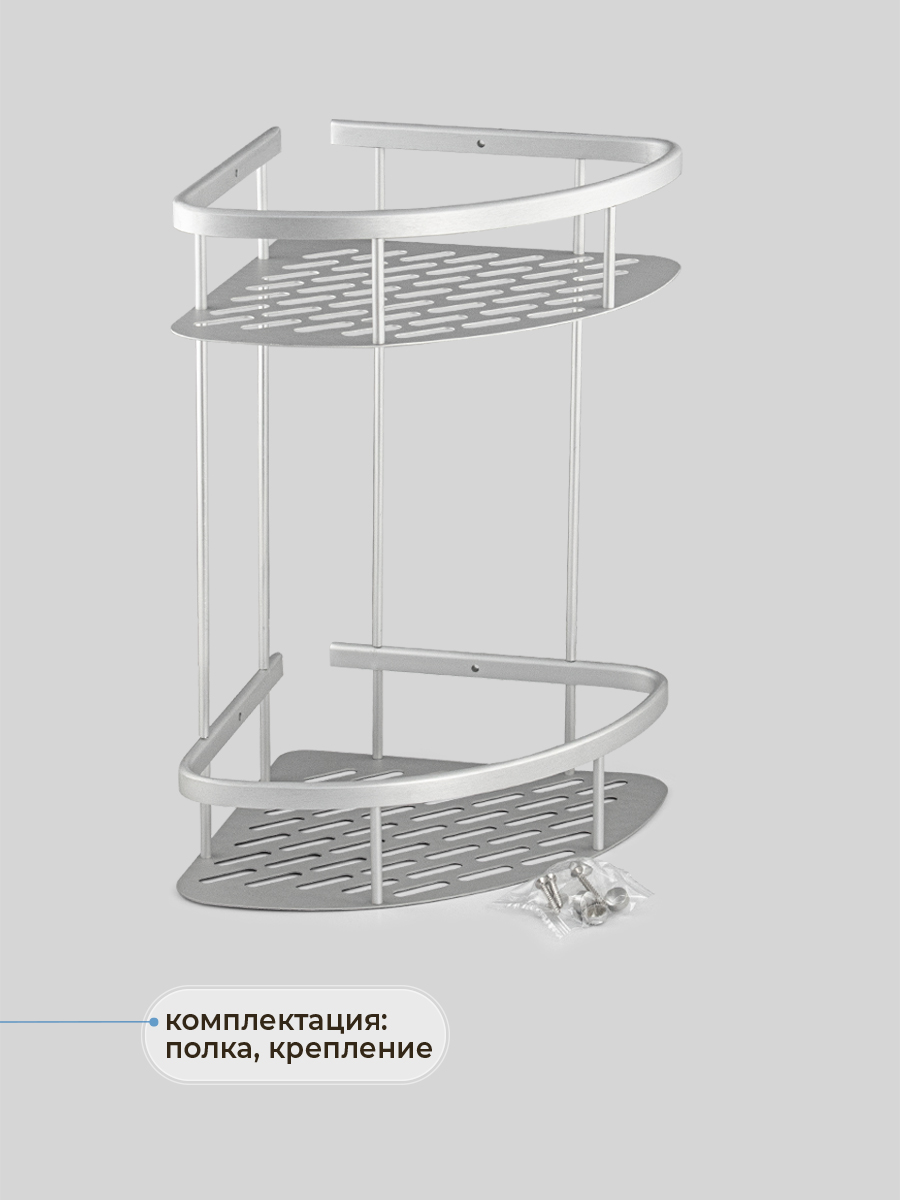 Полочка для принадлежностей угловая, двойная, с литым дном, обладает высокими эксплуатационными характеристиками и подходит для использования дома, в общественных местах: отелях, ресторанах и пр. Изготовлена из высокопрочного алюминия с матовым покрытием, которое придает безупречный вид и долговечность. Аксессуар не занимает много места, надежно фиксируется к стене при помощи набора креплений и служит удобным местом для хранения бытовых и косметических средств. Габаритные размеры: высота 365 мм, ширина 290 мм, глубина 220 мм, высота полки 55 мм, расстояние между полками 255 мм. Вес - 0,600 кг, объём - 0,01594 м3.