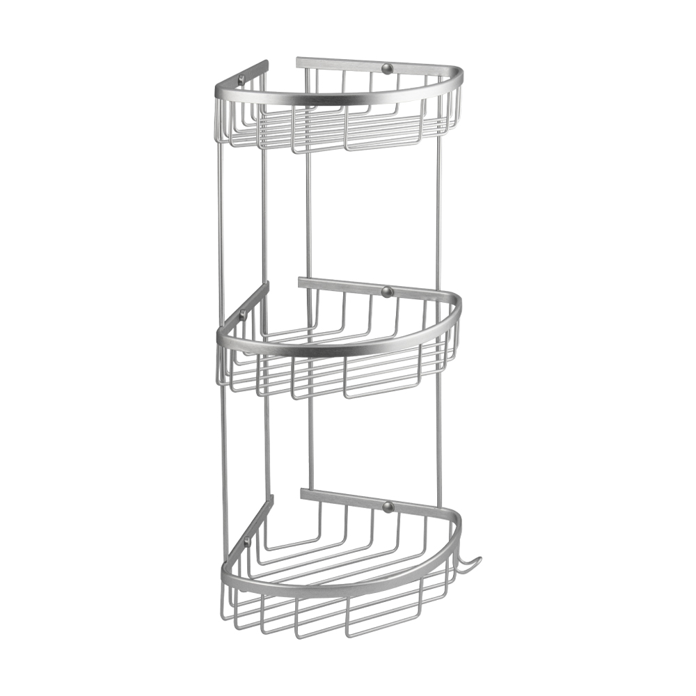 Полочка для принадлежностей угловая, решётка, трёхэтажная, с крючком, обладает высокими эксплуатационными характеристиками и подходит для использования дома, в общественных местах: отелях, ресторанах и пр. Изготовлена из прочного алюминия с матовым покрытием, которое придает безупречный вид и долговечность. Аксессуар не занимает много места, надежно фиксируется к стене при помощи набора креплений (входят в комплект) и служит удобным местом для хранения бытовых и косметических средств. Габаритные размеры: высота 560 мм, ширина 260 мм, длина 180 мм, расстояние между полками 180 мм. Вес - 0,600 кг, объём - 0,01365 м3