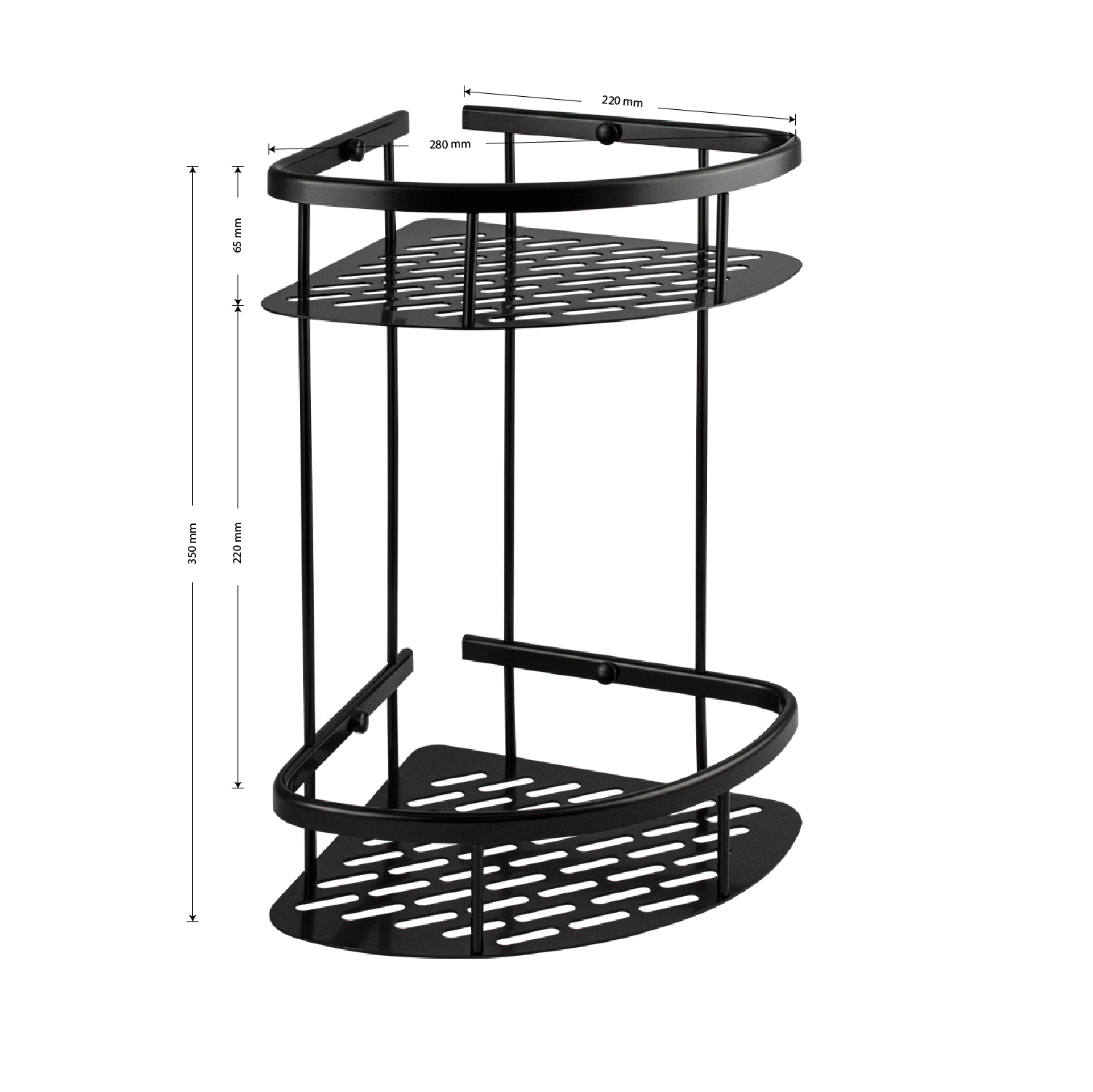 Полочка для принадлежностей закруглённая с литым дном двухэтажная, обладает высокими эксплуатационными характеристиками и подходит для использования дома, в общественных местах: отелях, ресторанах и пр. Изготовлена из высокопрочного алюминия с матовым покрытием чёрного цвета, которое придает безупречный вид и долговечность. Аксессуар не занимает много места, надежно фиксируется к стене при помощи набора креплений (входят в комплект) и служит удобным местом для хранения бытовых и косметических средств. Габаритные размеры: высота 350 мм, ширина 280 мм, глубина 220 мм, высота полки 65 мм, расстояние между полками 220 мм. Вес - 0,600 кг, объём - 0,01125 м3.