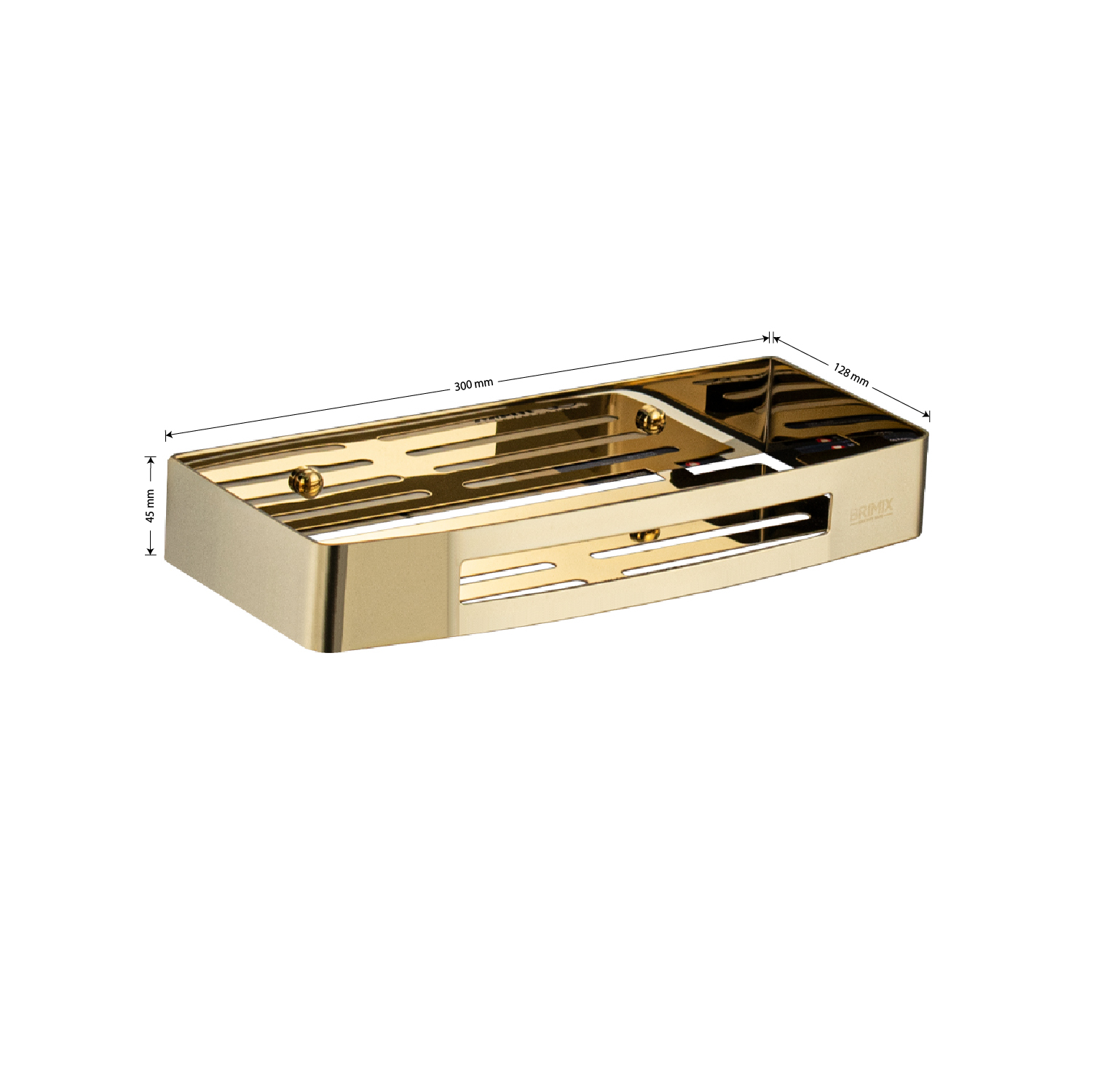 Полочка для принадлежностей, прямоугольная, с литым дном, одноэтажная, обладает высокими эксплуатационными характеристиками и подходит для использования дома, в общественных местах: отелях, ресторанах и пр. Изготовлена из прочной нержавеющей стали с золотым покрытием, которое придает безупречный внешний вид и долговечность. Аксессуар не занимает много места, надежно фиксируется к стене при помощи набора креплений (входят в комплект) и служит удобным местом для хранения бытовых и косметических средств. Габаритные размеры: длина 300 мм, ширина 128 мм, высота 45 мм. Вес - 0,740 кг, объём - 0,0035 м3.