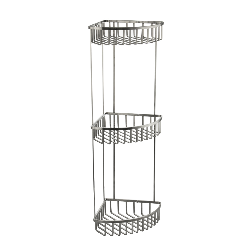 Полочка угловая, овальная, трёхэтажная, для принадлежностей, решётка с плоскими толстыми прутьями, обладает высокими эксплуатационными характеристиками и подходит для использования дома, в общественных местах: отелях, ресторанах и пр. Изготовлена из прочной нержавеющей стали с матовым покрытием, которое придает безупречный внешний вид и долговечность. Аксессуар не занимает много места, надежно фиксируется к стене при помощи набора креплений (входят в комплект) и служит удобным местом для хранения бытовых и косметических средств. Габаритные размеры: высота 670 мм, ширина 270 мм, глубина 200 мм, расстояние между полками 250 мм. Вес - 1,900 кг, объём - 0,01600 м3.
