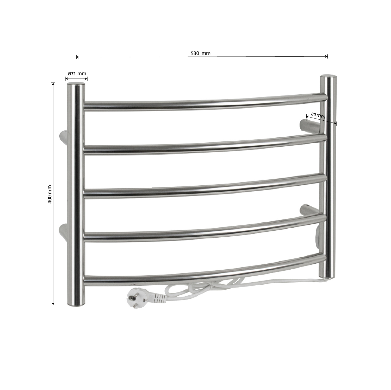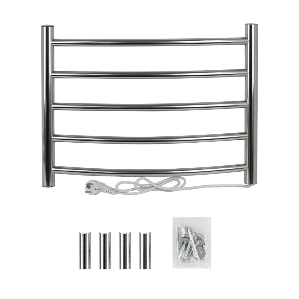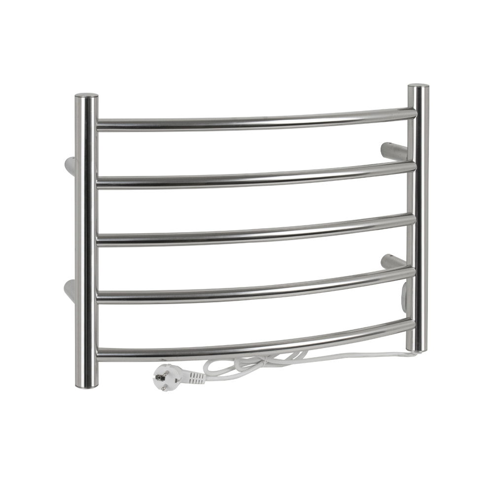 Полотенцесушитель электрический классик, премиум, дуга, лесенка, из нержавеющей стали 304, тэн из углеродного волокна, гармонично впишется в современный интерьер и поможет поддержать комфортную атмосферу в ванной комнате, работает вне зависимости от отопительного сезона, и его можно разместить в любом месте ванной или даже на стене в комнате. Хромированная поверхность устойчива к высоким температурам. Благодаря продуманному расположению труб можно размещать объемный текстиль, сократив время просушки. Установка и ремонт не требуют работы сантехников. Габаритные размеры: высота 500 мм, ширина 530 мм, глубина 80 мм. 5 перекладин, с сухим ТЭНом, 65 W, 220-230 V, 50-60 Гц, t - 50°С, IP 44. Комплект: полотенцесушитель, крепёж, провод с евровилкой для подключения. Вес - 2,700 кг, объём - 0,02000 м3.