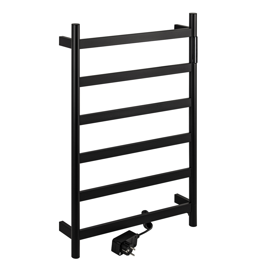 Полотенцесушитель электрический, цвет чёрный, лесенка, из нержавеющей стали, сенсорное управление с таймером до 24 часов, регулировка температуры от 35°С до 70°С, тэн из углеродного волокна, гармонично впишется в современный интерьер и поможет поддержать комфортную атмосферу в ванной комнате, работает вне зависимости от отопительного сезона, и его можно разместить в любом месте ванной  или даже на стене в комнате. PVD покрытие чёрного цвета, устойчивое к высоким температурам. Благодаря продуманному расположению труб можно размещать объемный текстиль, сократив время просушки. Установка и ремонт не требуют работы сантехников. Габаритные размеры: ширина 480 мм, высота 730 мм, глубина 90 мм. 6 перекладин, с сухим ТЭНом, 75 W, 220-230 V, 50-60 Гц, t  55°С, IP 44. Комплект: полотенцесушитель, крепёж, провод с евровилкой для подключения. Вес - 4,000 кг, объём - 0,06 м3.