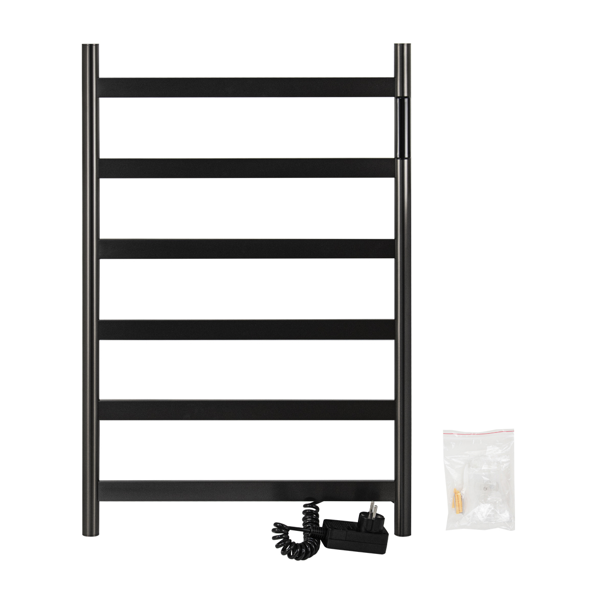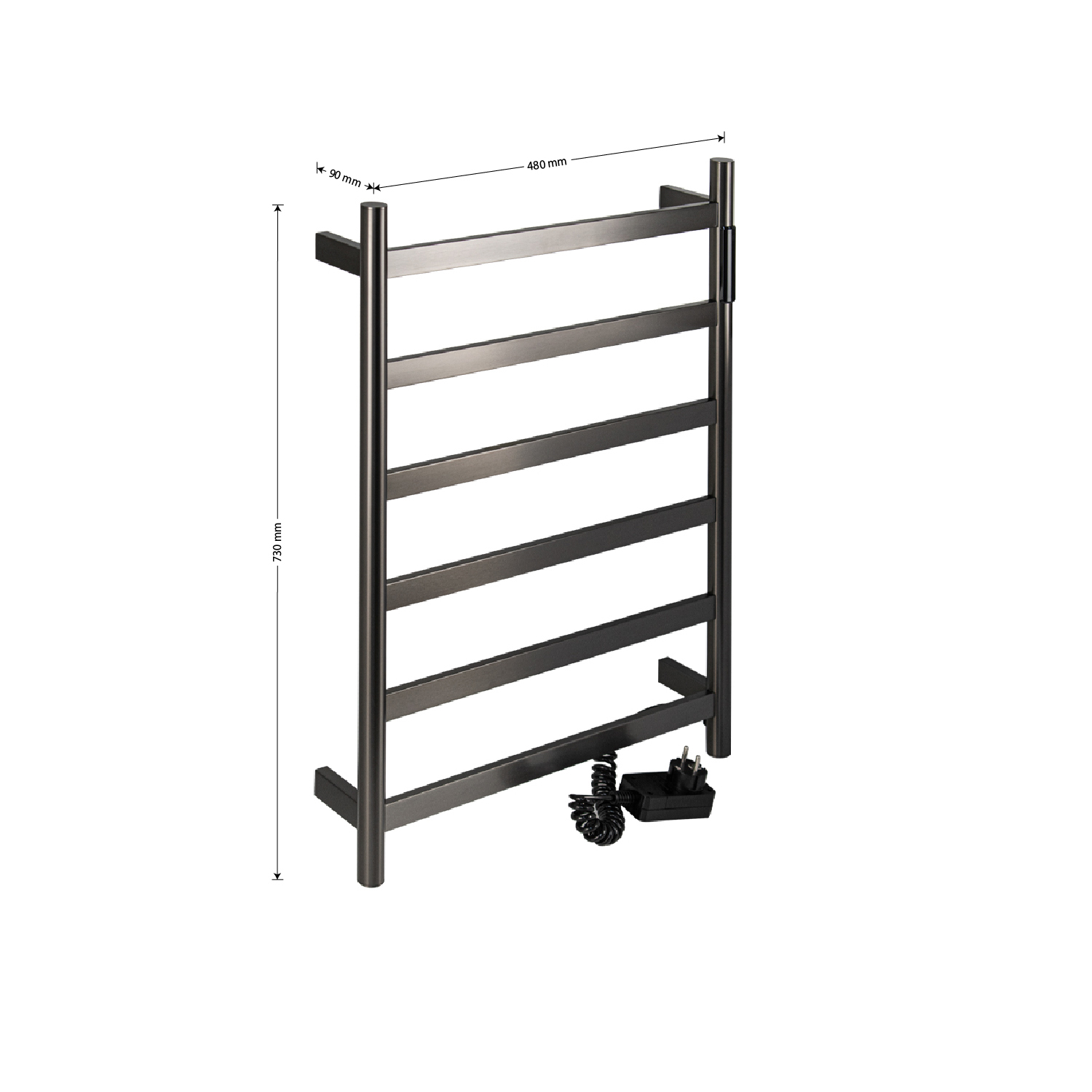 Полотенцесушитель электрический, цвет ГРАФИТ, лесенка из нержавеющей стали марки 304, с таймером до 24 часов, регулировка температуры от 35°С до 70°С, тэн из углеродного волокна, гармонично впишется в современный интерьер и поможет поддержать комфортную атмосферу в ванной комнате, работает вне зависимости от отопительного сезона, и его можно разместить в любом месте ванной или даже на стене в комнате. Матовая поверхность устойчива к высоким температурам. Благодаря продуманному расположению труб можно размещать объемный текстиль, сократив время просушки. Установка и ремонт не требуют работы сантехников. Габариты и параметры: ширина 480 мм, высота 730 мм, глубина 90 мм. 6 перекладин, с сухим ТЭНом, 75 W, 220-230 V, 50-60 Гц, t - 55°С, IP 44. Комплект: полотенцесушитель, крепёж, провод с евровилкой для подключения. Вес - 4,0 кг, объём - 0,06 м3
