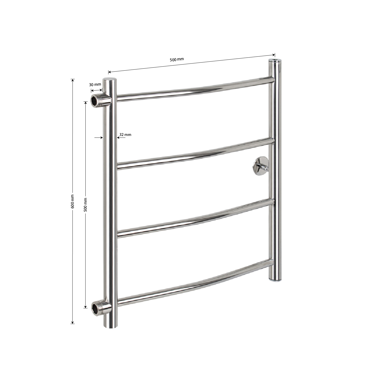 Водяной полотенцесушитель, хромированный, лесенка - дуга с боковым подключением м/осевое - 500 мм, изготовлен из высокопрочной нержавеющей стали. Металл устойчив к коррозии и деформации, отлично выдерживает перепады температуры и давления в системе водоснабжения. После установки полотенцесушителя в помещении становится значительно комфортнее: уменьшается влажность, исчезает конденсат, снижается риск появления плесени. Изделие не только поддержит комфортную температуру в санузле, но и быстро просушит белье. Подключение 1". Подключается к системе горячего водоснабжения, функционирует круглый год. Габаритные размеры: высота 600 мм, ширина 500 мм, диаметр трубы 32 мм, толщина 2 мм. Комплект : полотенцесушитель, 1 крепление, кран Маевского поможет удалить воздух из системы, декоративные заглушки. Вес - 3,300 кг, объём - 0,01500 м3.