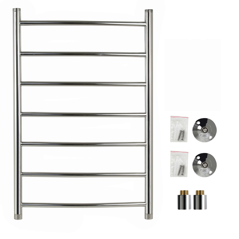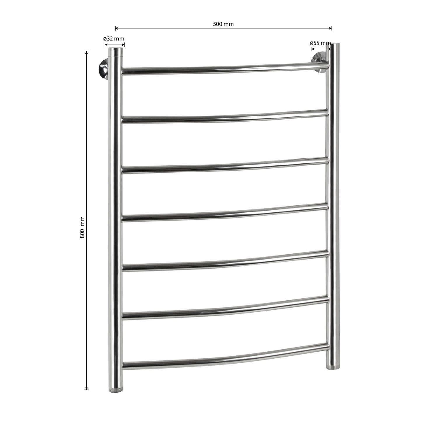 Водяной полотенцесушитель, хромированный, лесенка - дуга, изготовлен из высокопрочной нержавеющей стали. Металл устойчив к коррозии и деформации, отлично выдерживает перепады температуры и давления в системе водоснабжения. После установки полотенцесушителя в помещении становится значительно комфортнее: уменьшается влажность, исчезает конденсат, снижается риск появления плесени. Изделие не только поддержит комфортную температуру в санузле, но и быстро просушит белье. Подключение 1". Подключается к системе горячего водоснабжения, функционирует круглый год. Габаритные размеры: высота 800 мм, ширина 500 мм, диаметр трубы 32 мм, толщина 2 мм. Комплект: полотенцесушитель, 2 крепление, кран Маевского поможет удалить воздух из системы, декоративные заглушки. Вес - 4,600 кг, объём - 0,04000 м3.