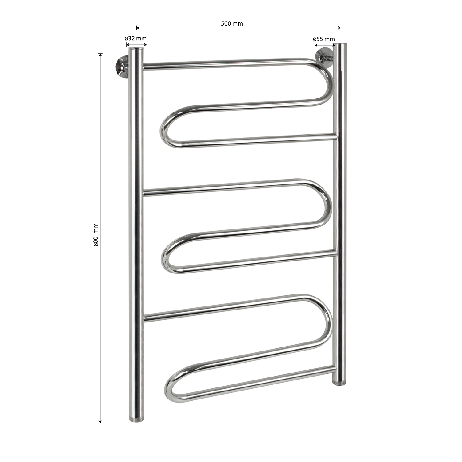 Водяной полотенцесушитель, хромированный, лесенка - зигзаг, изготовлен из высокопрочной нержавеющей стали. Металл устойчив к коррозии и деформации, отлично выдерживает перепады температуры и давления в системе водоснабжения. После установки полотенцесушителя в помещении становится значительно комфортнее: уменьшается влажность, исчезает конденсат, снижается риск появления плесени. Изделие не только поддержит комфортную температуру в санузле, но и быстро просушит белье. Подключение 1". Подключается к системе горячего водоснабжения, функционирует круглый год. Габаритные размеры: высота 850 мм, ширина 500 мм, диаметр трубы 32 мм, толщина 2 мм. Комплект: полотенцесушитель, 2 крепление, кран Маевского поможет удалить воздух из системы, декоративные заглушки. Вес - 5,400 кг, объём - 0,04000 м3.
