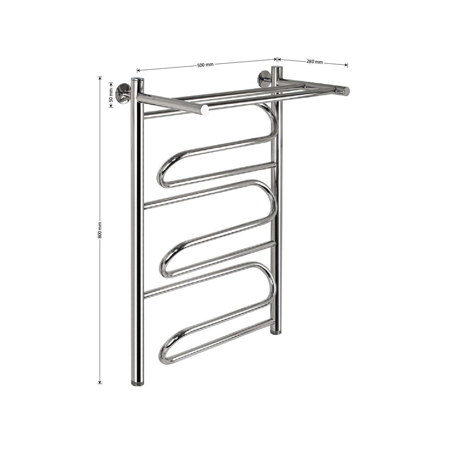 Водяной полотенцесушитель, хромированный, лесенка - зигзаг с полкой, изготовлен из высокопрочной нержавеющей стали. Металл устойчив к коррозии и деформации, отлично выдерживает перепады температуры и давления в системе водоснабжения. После установки полотенцесушителя в помещении становится значительно комфортнее: уменьшается влажность, исчезает конденсат, снижается риск появления плесени. Изделие не только поддержит комфортную температуру в санузле, но и быстро просушит белье. Подключение 1". Подключается к системе горячего водоснабжения, функционирует круглый год. Габаритные размеры: высота 800 мм, ширина 500 мм, глубина от стены 280 мм, диаметр трубы 32 мм, толщина 2 мм. Комплект: полотенцесушитель, 4 крепления, кран Маевского поможет удалить воздух из системы, декоративные заглушки. Вес - 6,800 кг, объём - 0,07800 м3.
