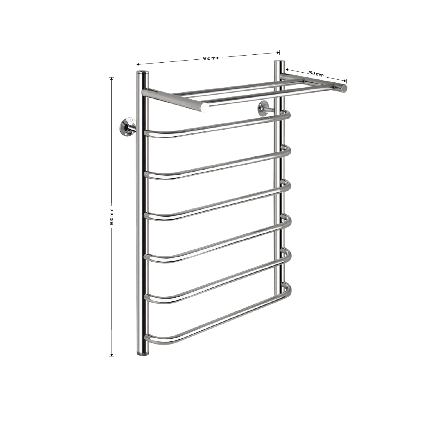 Водяной полотенцесушитель, хромированный, лесенка - скоба с полкой, изготовлен из высокопрочной нержавеющей стали. Металл устойчив к коррозии и деформации, отлично выдерживает перепады температуры и давления в системе водоснабжения. После установки полотенцесушителя в помещении становится значительно комфортнее: уменьшается влажность, исчезает конденсат, снижается риск появления плесени. Изделие не только поддержит комфортную температуру в санузле, но и быстро просушит белье. Подключение 1". Подключается к системе горячего водоснабжения, функционирует круглый год. Габаритные размеры: высота 800 мм, ширина 500 мм, полка 160 мм, диаметр трубы 32 мм, толщина 2 мм. Комплект: полотенцесушитель, 4 крепления, кран Маевского поможет удалить воздух из системы, декоративные заглушки. Вес - 6,600 кг, объём - 0,08000 м3.