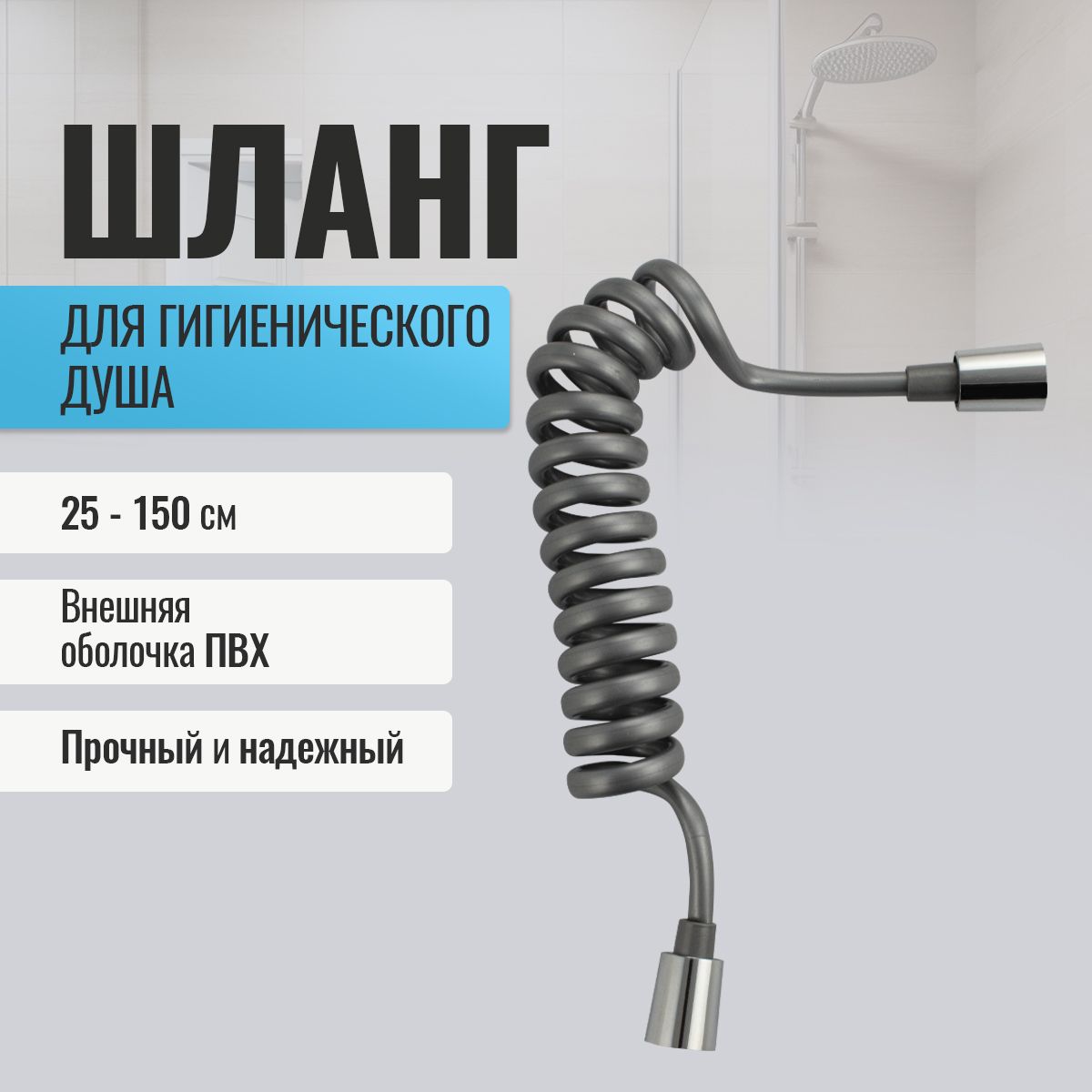 Универсальный гибкий душевой шланг для биде пружинный, серый, внешняя оболочка произведена из современного ПВХ, сочетает в себе отличные эксплуатационные характеристики и приятный дизайн. Достоинства этого устройства — в его особой структуре: трубка не выпадет из лейки благодаря прочному крепежу. Прочный и надежный шланг, прост в монтаже, удобен в использовании, подключение имп/имп-конус. Выходы шлага: 1/2. Длина шланга 25-150 см. Вес - 0,100 кг, объём - 0,00171 м3.