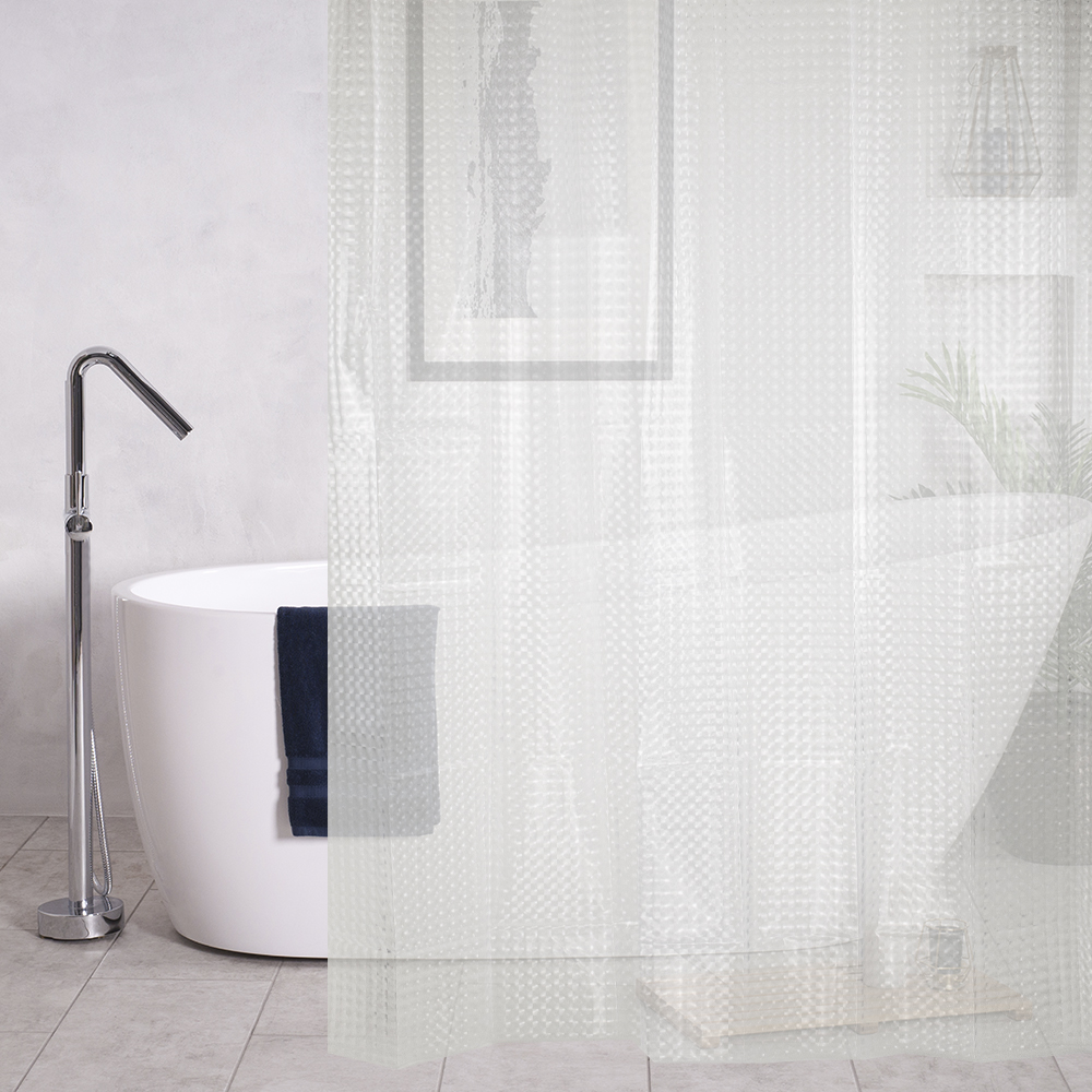 Полупрозрачная штора для ванны с 3Д эффектом. Штора подойдет для любого интерьера ванной комнаты, она полупрозрачная и зрительно увеличивает пространство, делает помещение светлым, а мебель и зеркало защищает от брызг. Шторка легкая, но достаточно плотная, водоотталкивающая, имеет стандартные размеры 180х180 сантиметров. Верхний край шторы уплотнен, для более надежного крепления на кольца, отверстия для колец обрамлены металлическими люверсами из нержавеющей стали. В комплекте прочные пластиковые кольца в количестве 12 штук для крепления к штанге. Изготовлена из современного экологичного материала EVA, который имеет ряд преимуществ перед другими материалами. В отличии от тканевой она абсолютно водонепроницаема и может не сразу приклеиться к ванне, чтобы улучшить прилипание, полейте бортик ванной водой из душевой лейки. В отличие от шторы из ПВХ, не имеет в составе вредных примесей, токсинов и хлора, гипоаллергенна и без запаха, материал, устойчивый к образованию грибка и плесени. Упакована в прочный пакет. Ве