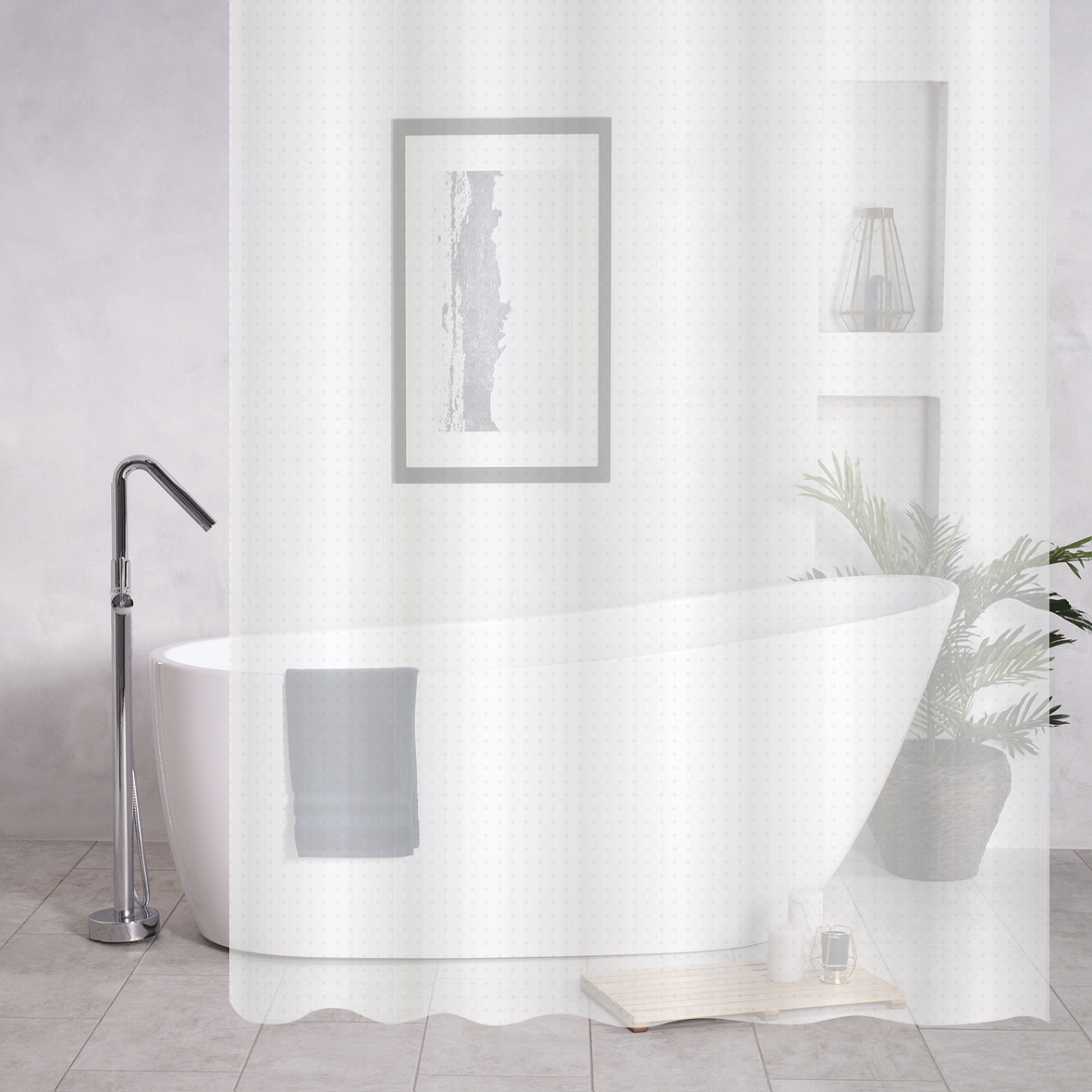 Штора для ванны белая, матовая. Штора подойдет для любого интерьера ванной комнаты, она полупрозрачная и зрительно увеличивает пространство, делает помещение светлым, а мебель и зеркало защищает от брызг. Шторка легкая, но достаточно плотная, водоотталкивающая, имеет стандартные размеры 180 х180 сантиметров. Верхний край шторы уплотнен, для более надежного крепления на кольца, отверстия для колец обрамлены металлическими люверсами из нержавеющей стали. В комплекте прочные пластиковые кольца в количестве 12 штук для крепления к штанге. Изготовлена из современного экологичного материала ПЕВА, который имеет ряд преимуществ перед другими материалами. В отличии от тканевой она абсолютно водонепроницаема и может не сразу приклеиться к ванне, чтобы улучшить прилипание, полейте бортик ванной водой из душевой лейки. В отличие от шторы из ПВХ, не имеет в составе вредных примесей, токсинов и хлора, гипоаллергенна и без запаха, материал, устойчивый к образованию грибка и плесени. Упакована в прочный пакет. Вес 0,37 кг, о