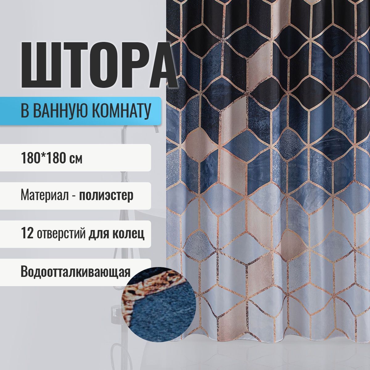 Штора с рисунком ГОЛУБОЙ МРАМОР с ЗОЛОТОМ, в ванную комнату, без колец - полиэстэр, 180 х 180 см.