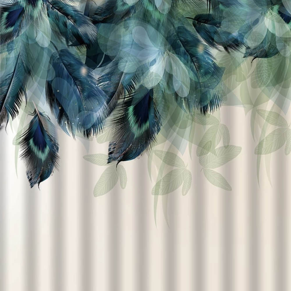 Штора с рисунком зелёные перья, в ванную комнату, без колец - полиэстэр